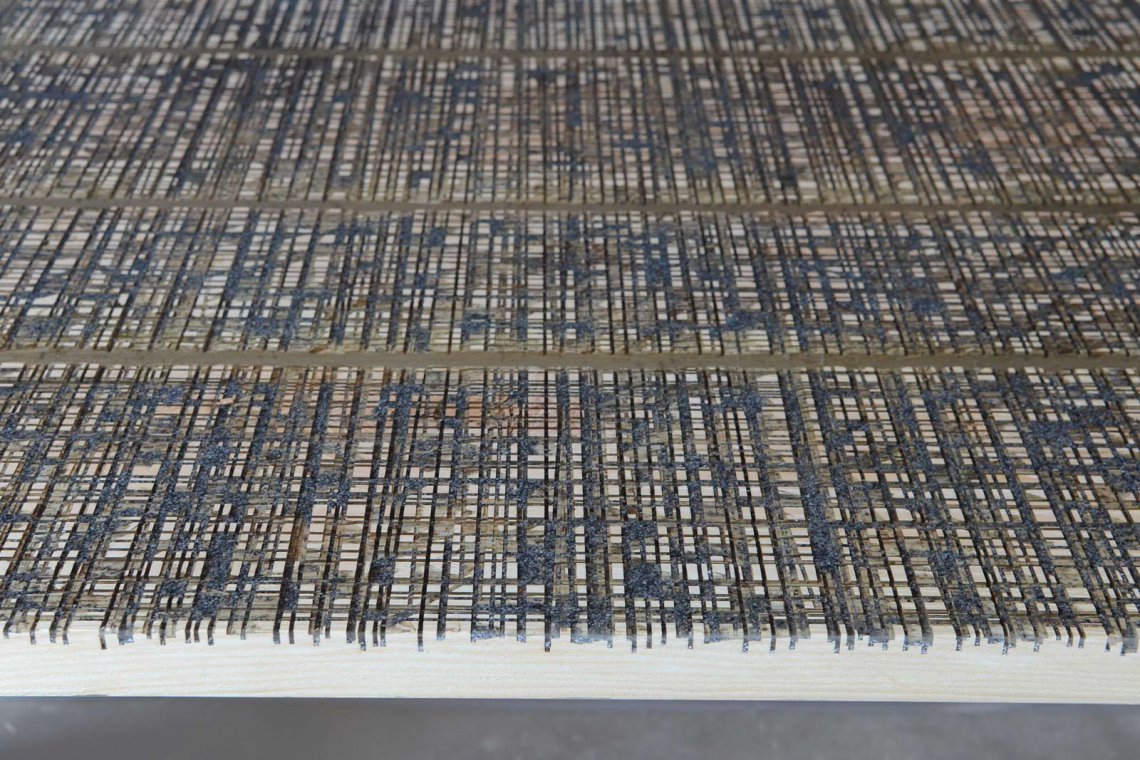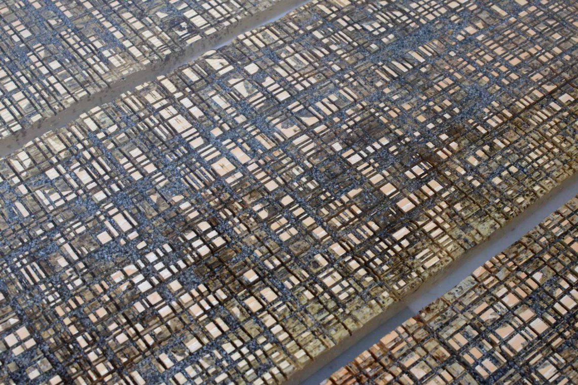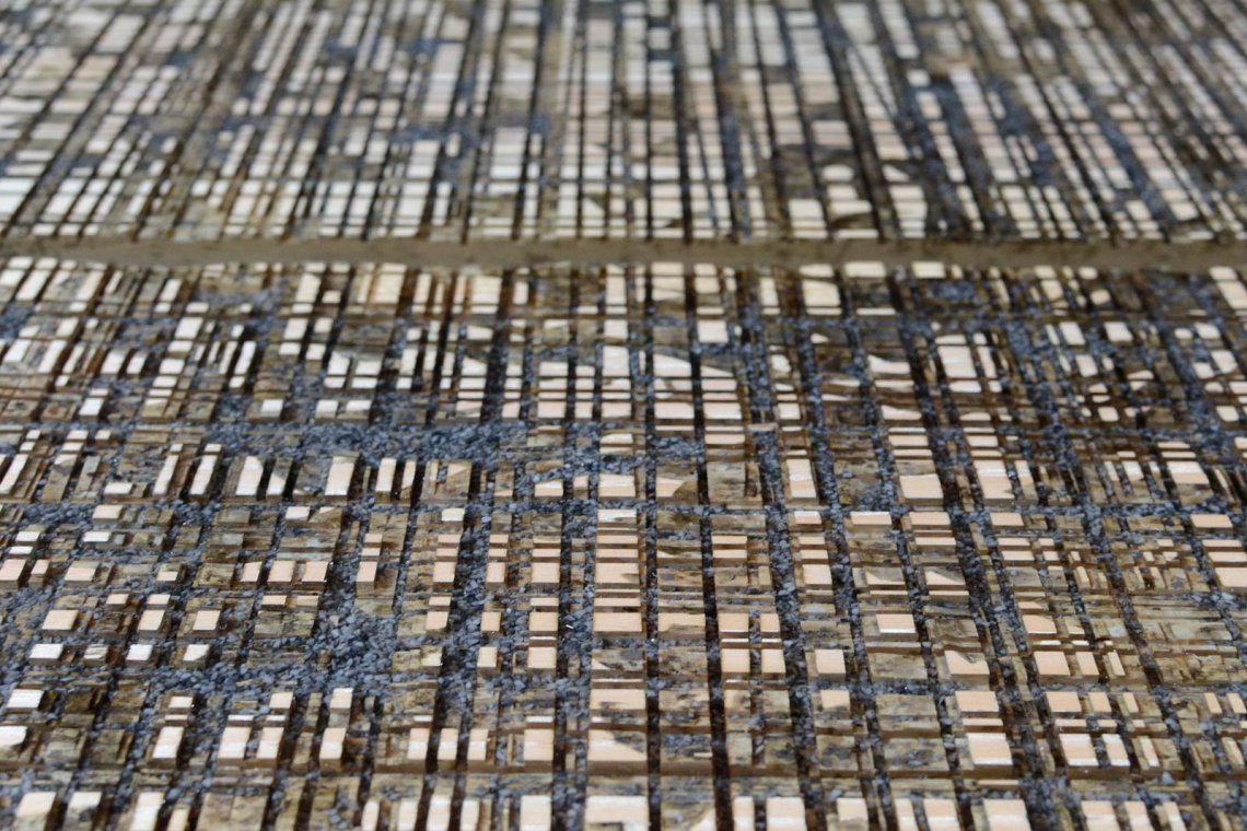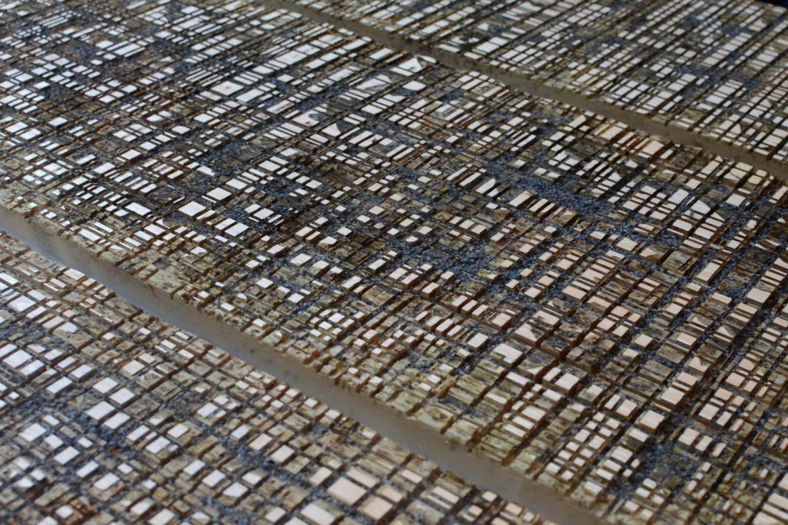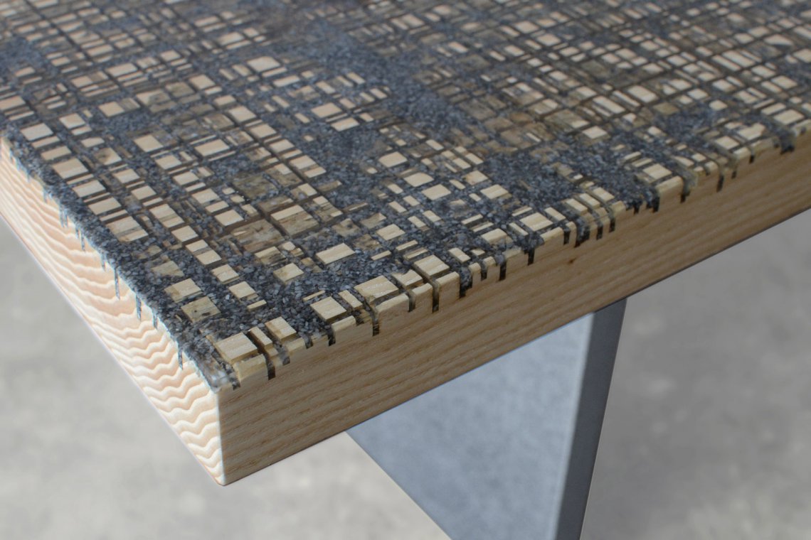 Like the water flow of the cutting operations, a transparent resin is poured on the uneven wood surface to encapsulate marble residues and level all the roughness.