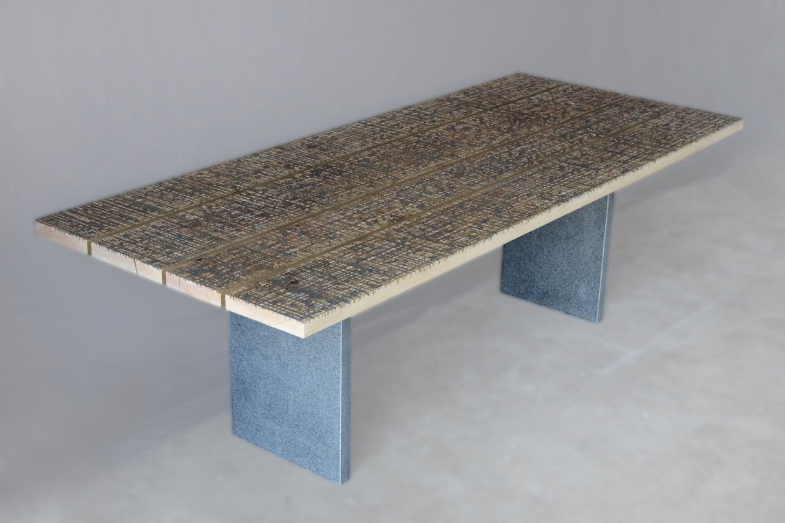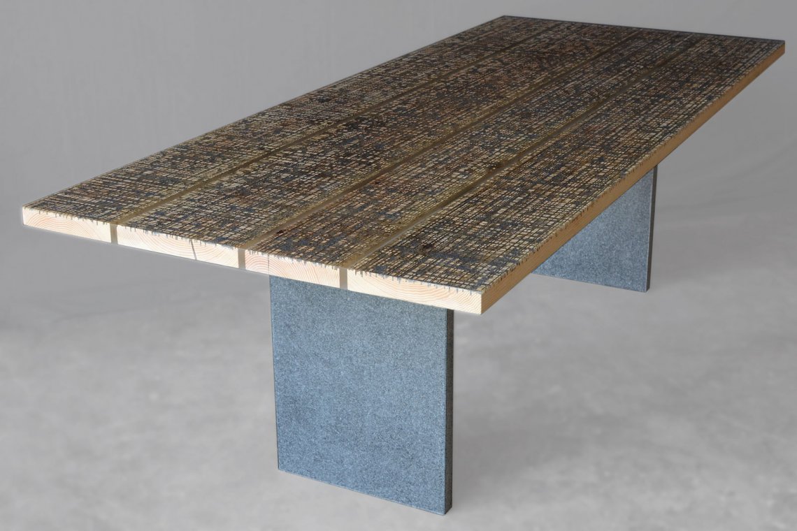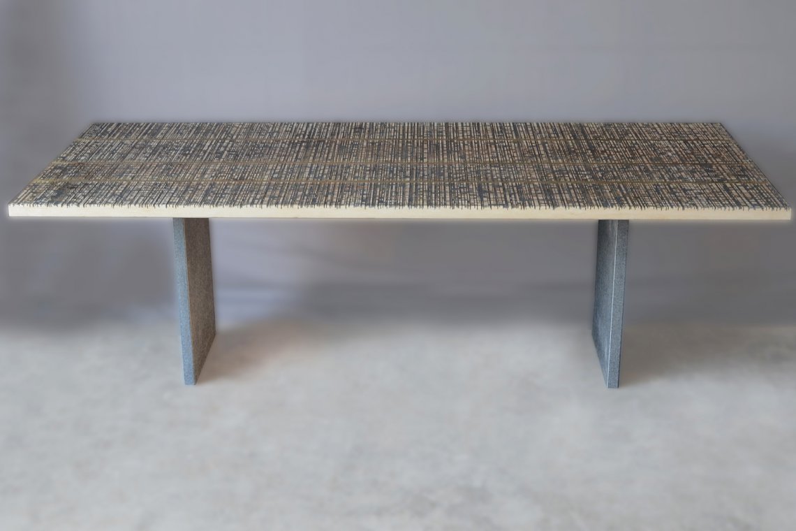 This table is made of four boards of a worktop of an Italian marble processing lab which was continuously scratched by huge circular blades used to cut blocks of stone.