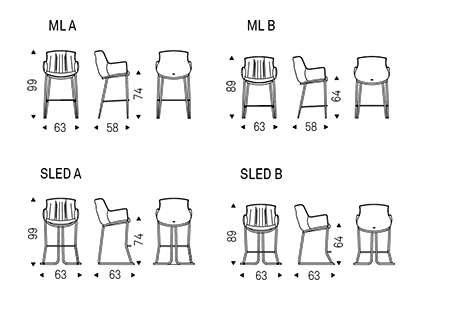 The rounded shapes in the Rhonda family of armchairs and stools exude a natural elegance that makes them ideal for furnishing comfortable and welcoming designer dining rooms. The soft folds that decorate the inside of the backrest contrast with the stretched frame that wraps around the body.