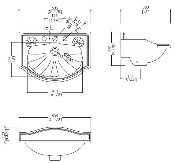 A washbasin in fine white porcelain, available with 1, 2 or 3 holes. With a distinctly classic taste, it is characterized by soft sinuosity and decorations that recall the organic shapes of a shell.