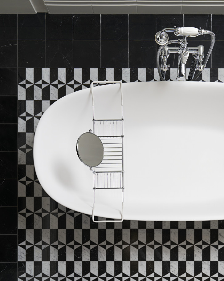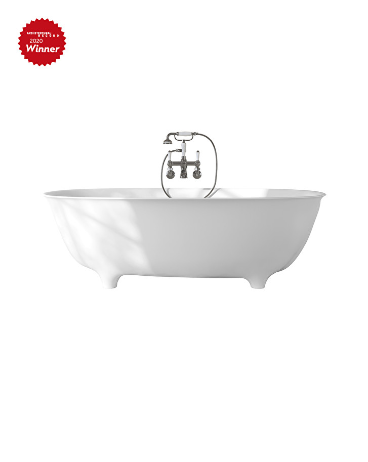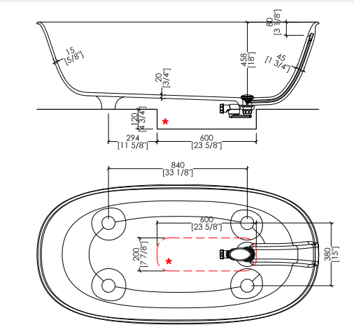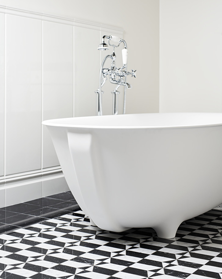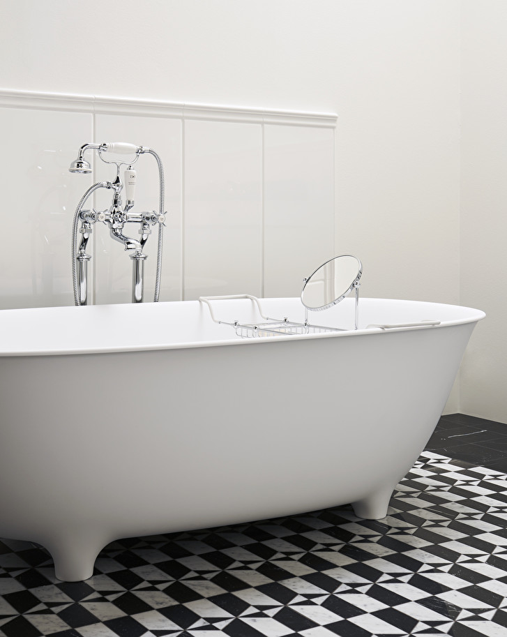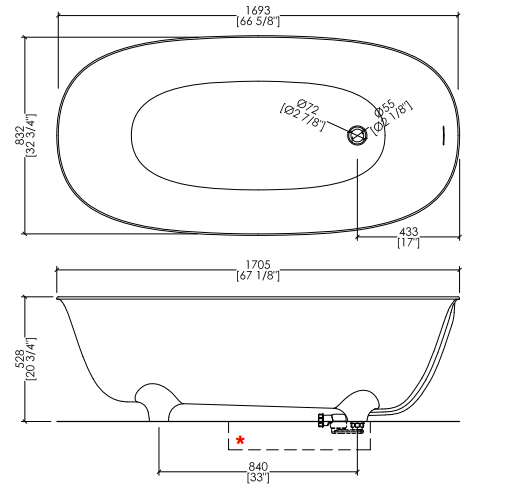 Drain with cover in White Tec Plus and siphoned trap assembly included. For this typology of bathtub installation it is necessary to prepare an opening in the floor.