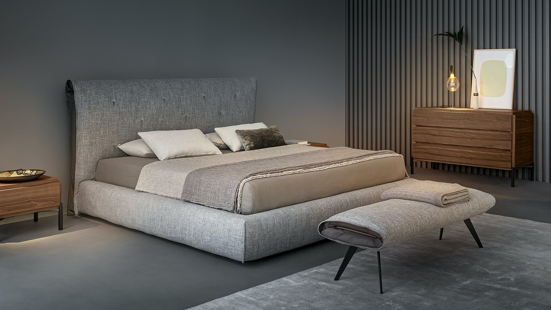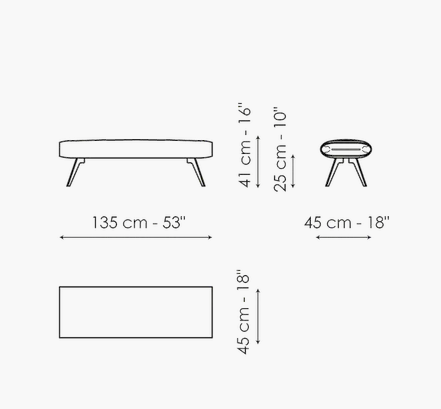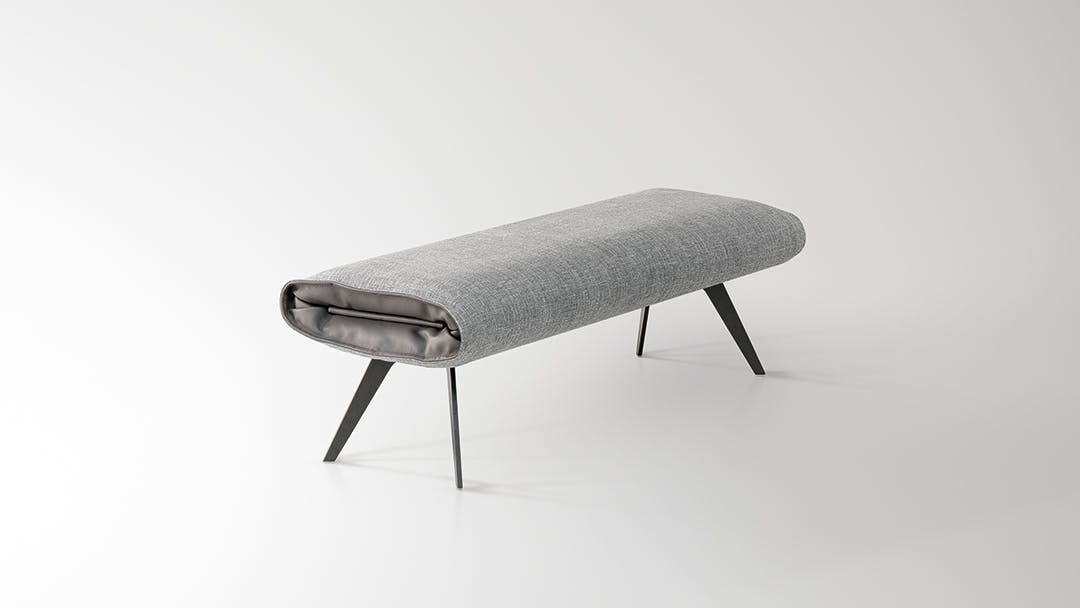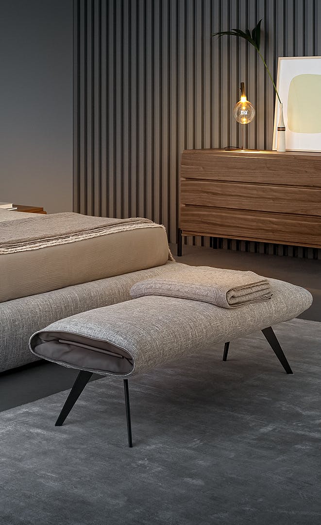 What causes the upholstered bed bench to stand out in the same way as the matching bed, is the precious leather insert, which allows a singular interplay of materials and combinations that create an appealing optical effect and highlight the extreme attention to detail. The shaped metal feet makes it even lighter.