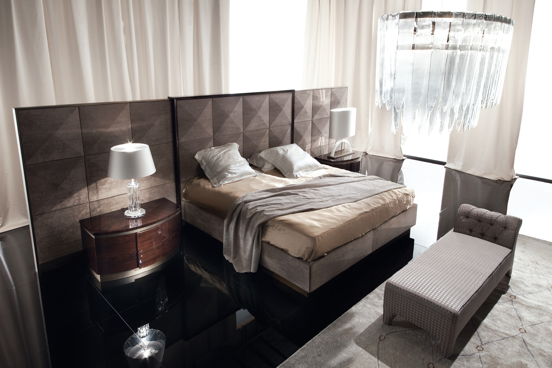 Upholstered bench with buttoned back, available in fi rst grade leather, nabuk leather, velvet, velour or suede fabric.