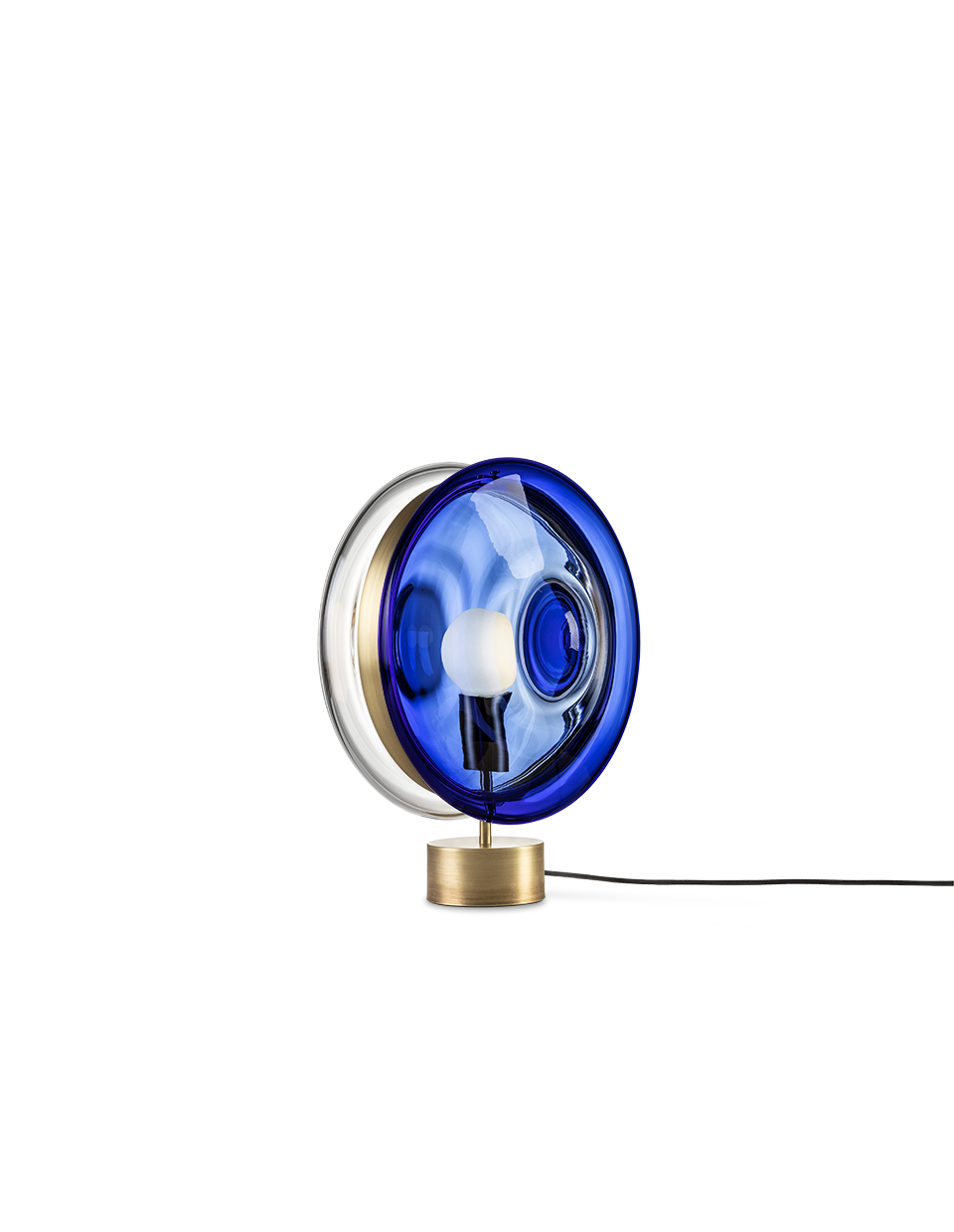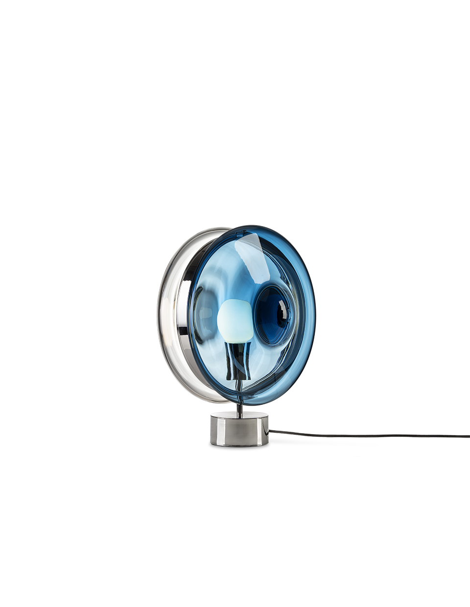 BOMMA’s Orbital traces paths of multicolored celestial bodies that glow with hypnotically red-hot cores. This ingenious design of mouth-blown glass lenses, held together by a metal mounting, creates a fascinating visual experience from many different angles. Our unique lighting objects in moonlight clear, pastel pink, sea blue, polar white and mysterious black, lend a truly magical atmosphere to any sophisticated interior.