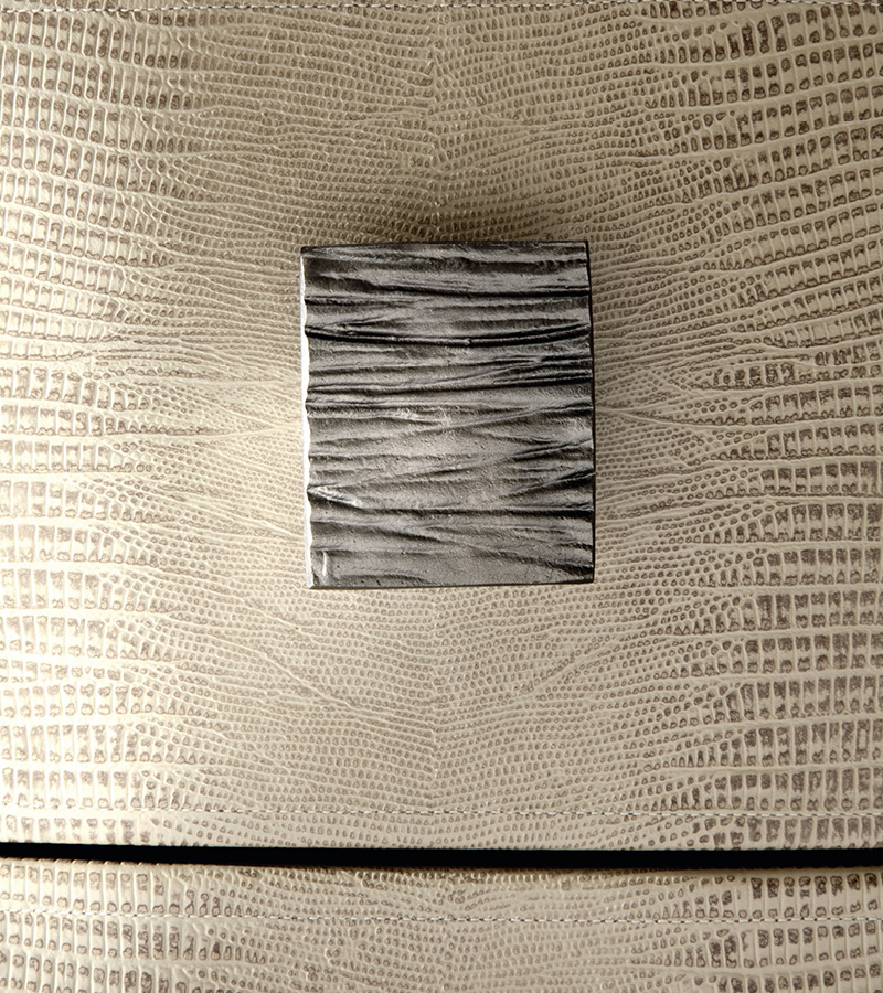 Single bookcase in armadillo printed leather with combination of bronzedbrass top, base and handles. Back center panel in high gloss polyester lacquerwith special led light sytem including touching switch. 1 full extension drawer + 1 full extension file drawer with bottom in armadillo printed leather. 2 inside adjustable glass shelves. Side panels in high gloss polyester lacquer with 3 glass shelves with special led light sytem.