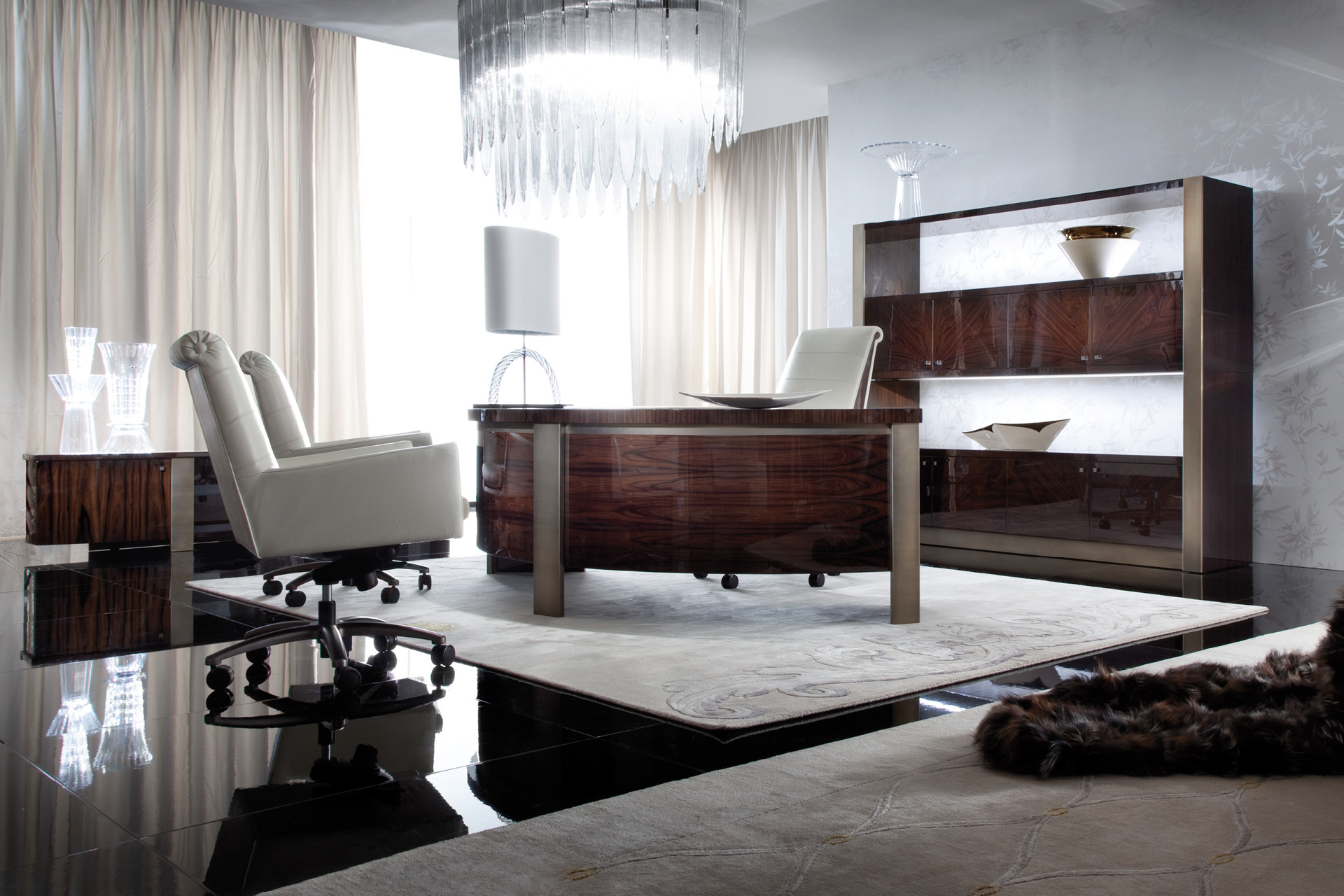 Bookcase in Brazilian rosewood veneer with high gloss polyester finish. 8 wooden doors and special led light sytem including touching switch. Details in bronzed stainless steel.