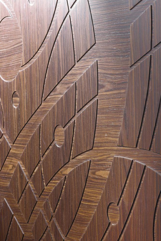Wooden cabinet system with Graffiti carving available in modules of different sizes, in all the wood finishes of the collection and in aniline-stained oak in all RAL colours.