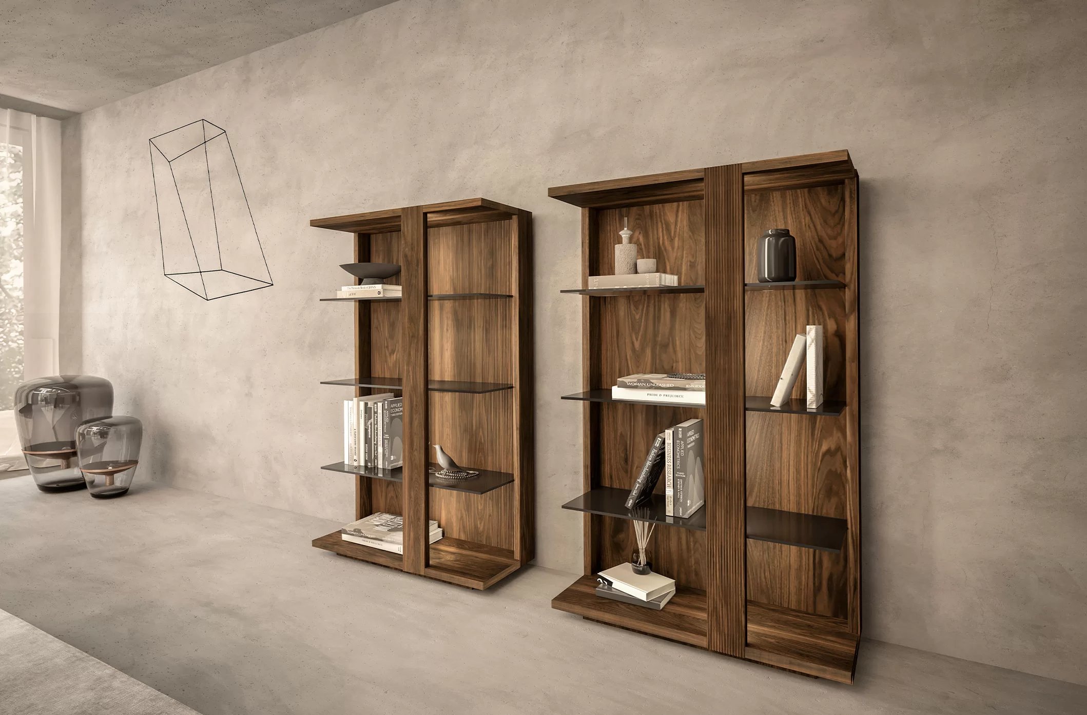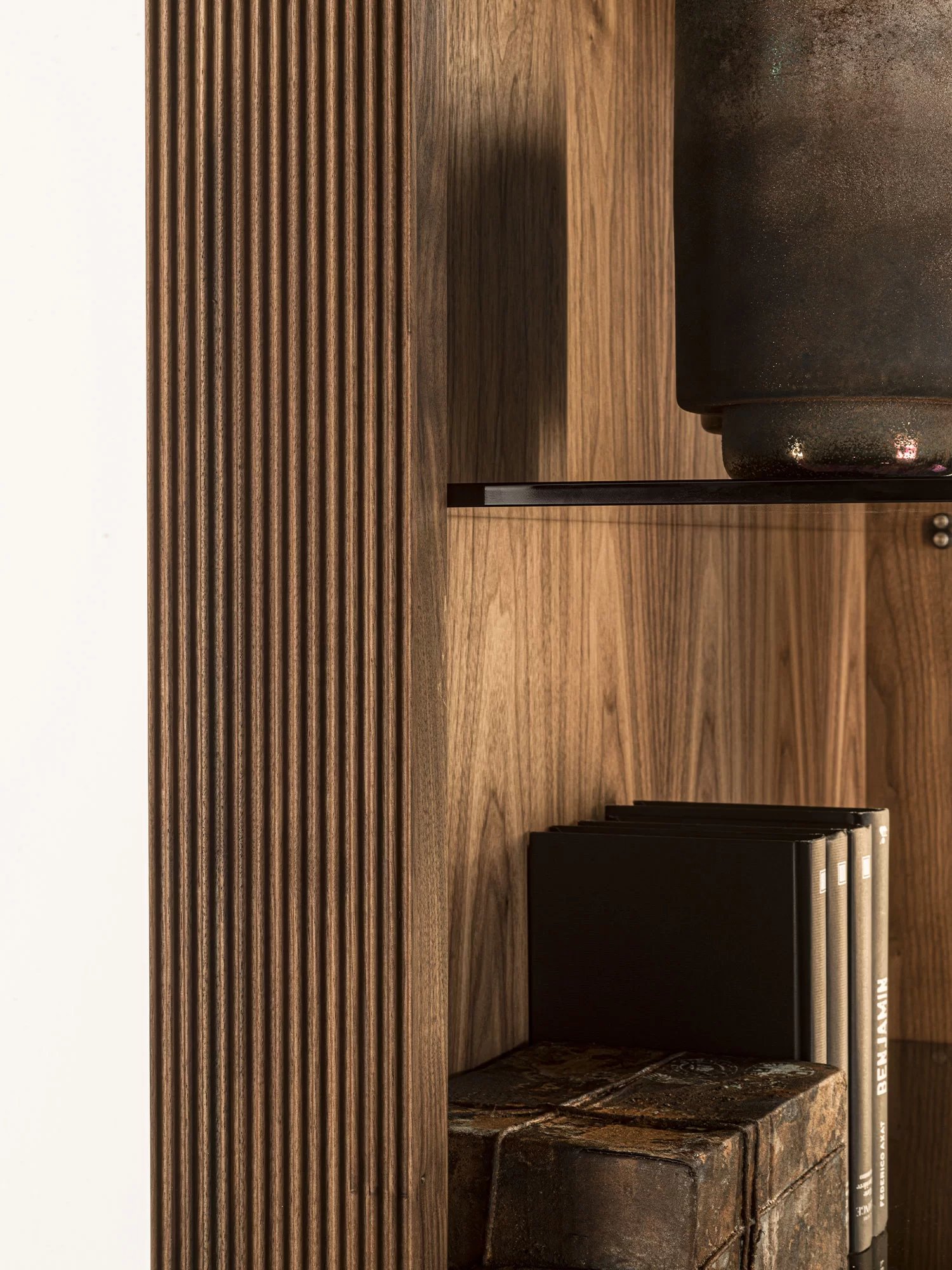 La collezione Revo viene completata da una credenza alta, a giorno, in legno massello e listellare, dotata di tre ripiani in vetro sp.10mm. Top e base in legno. Disponibile in due versioni: con schienale caratterizzato da una particolare lavorazione verticale, Fresart, che crea un effetto geometrico moderno e dinamico oppure con decorazione Fresart applicata sulle tre fascie verticale perimetrali strutturali. Illuminata con sistema di luci LED con accensione tramite telecomando.