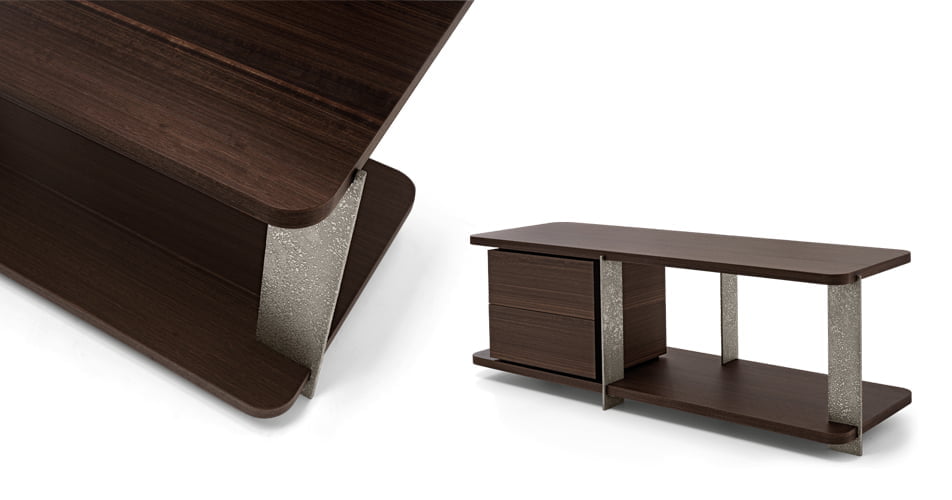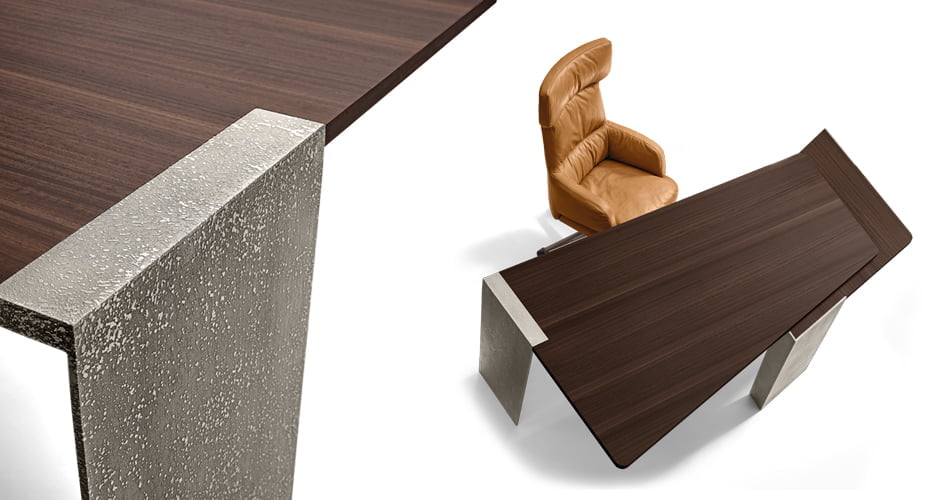 Scrivania executive e consòl(fā)le: top e pannelli laterali in una nuova essenza di eucalipto, gambe e piedi in metallo texturizzato Magnesio in tonalità grigio-argenteo.