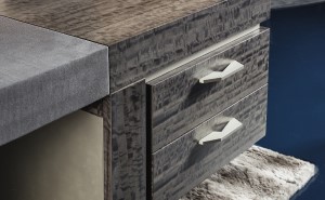Una scrivania imponente, simbolo di potere. Un monolite in legno sostenuto da un leggero basamento in acciaio. L’inserto perimetrale in acciaio esalta la cura del dettaglio. disponibile in varie essenze, dall’Eucalipto Frisè Grigio, alla Piuma di Noce, al Palissandro.
