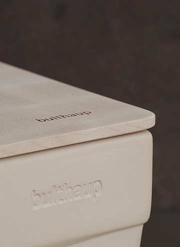 With the bulthaup bread container, bread stays fresh for many days. The 15-liter container in white stone stores moisture, and releases it slowly keeping the bread, from drying for a longer period of time. The bread can also be sliced evenly on the lid made from untreated maple wood.