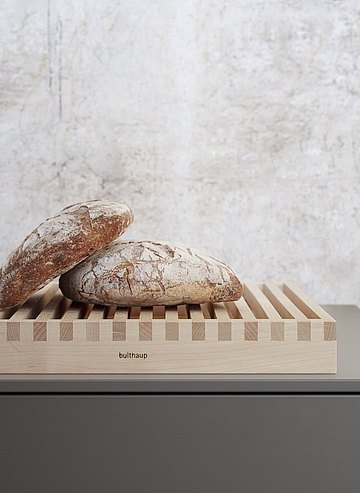 The bread cutting board is craftsman-made with traditional finger joints. It has a practical side too: The crumbs simply fall through the grille into the slide-in catching tray underneath. This can be pulled out and easily cleaned as needed.