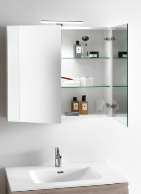 Shelf with mirrored front, open-sided right and left, 2 shelves