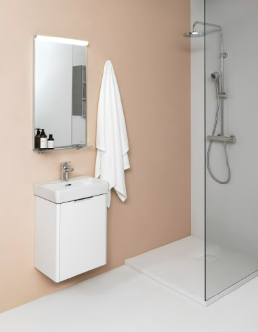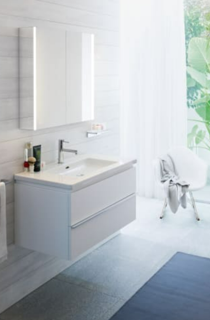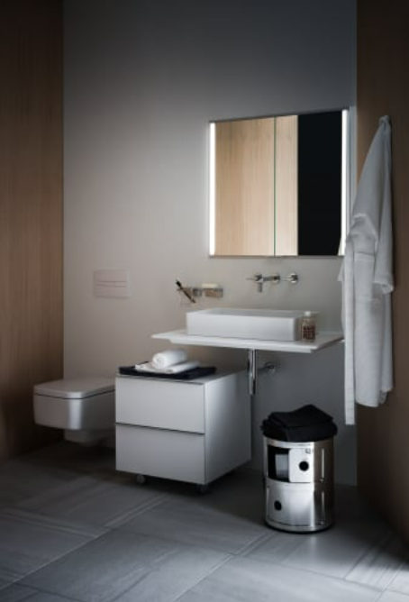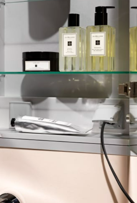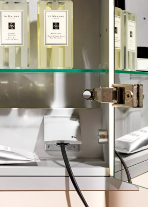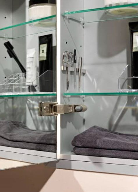 Mirror cabinet, 450 mm, aluminium, 1 door mirrored on both sides, left hinged, with sensor switch, 2 sockets, 2 vertical LED lighting elements (dimmable)