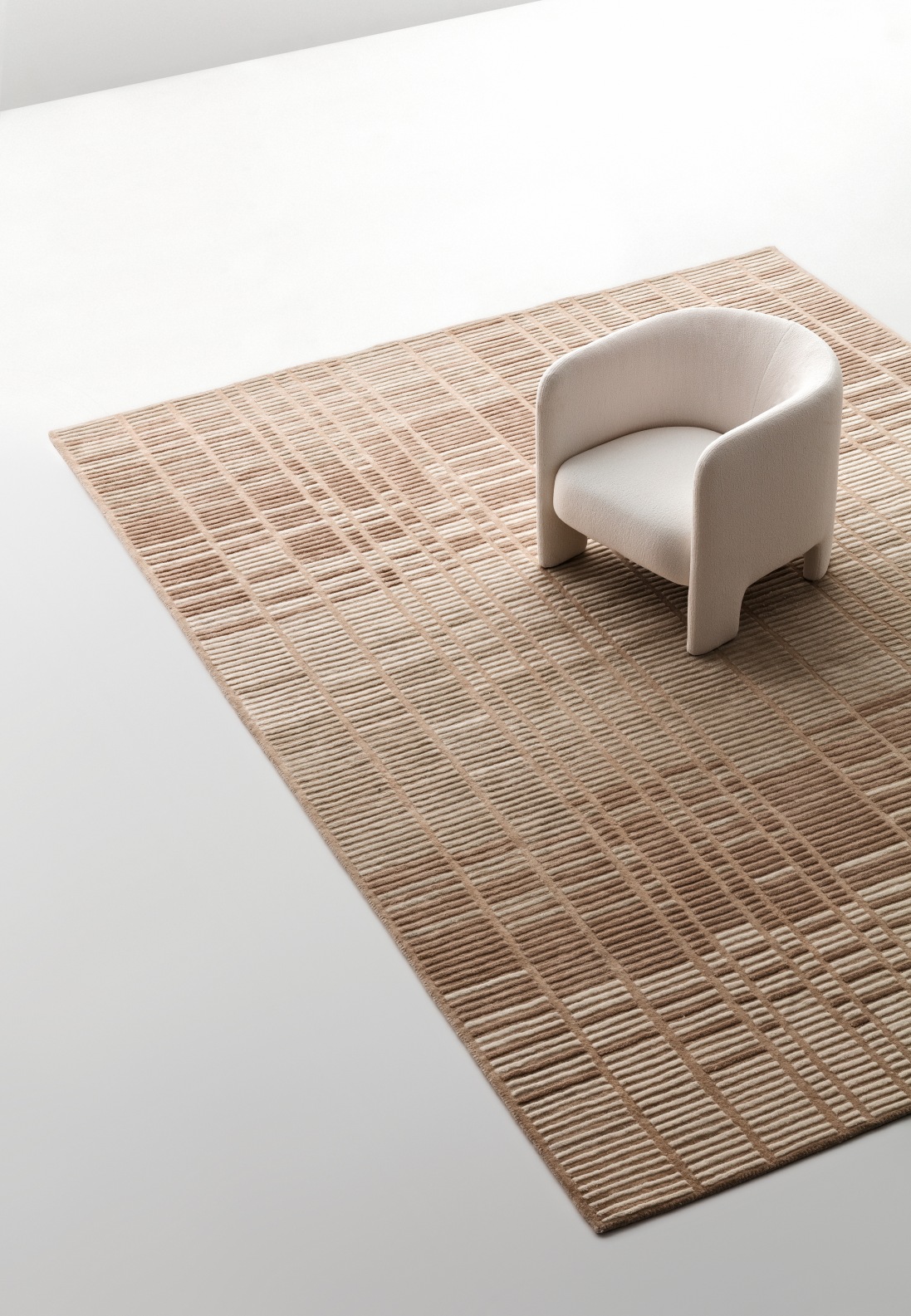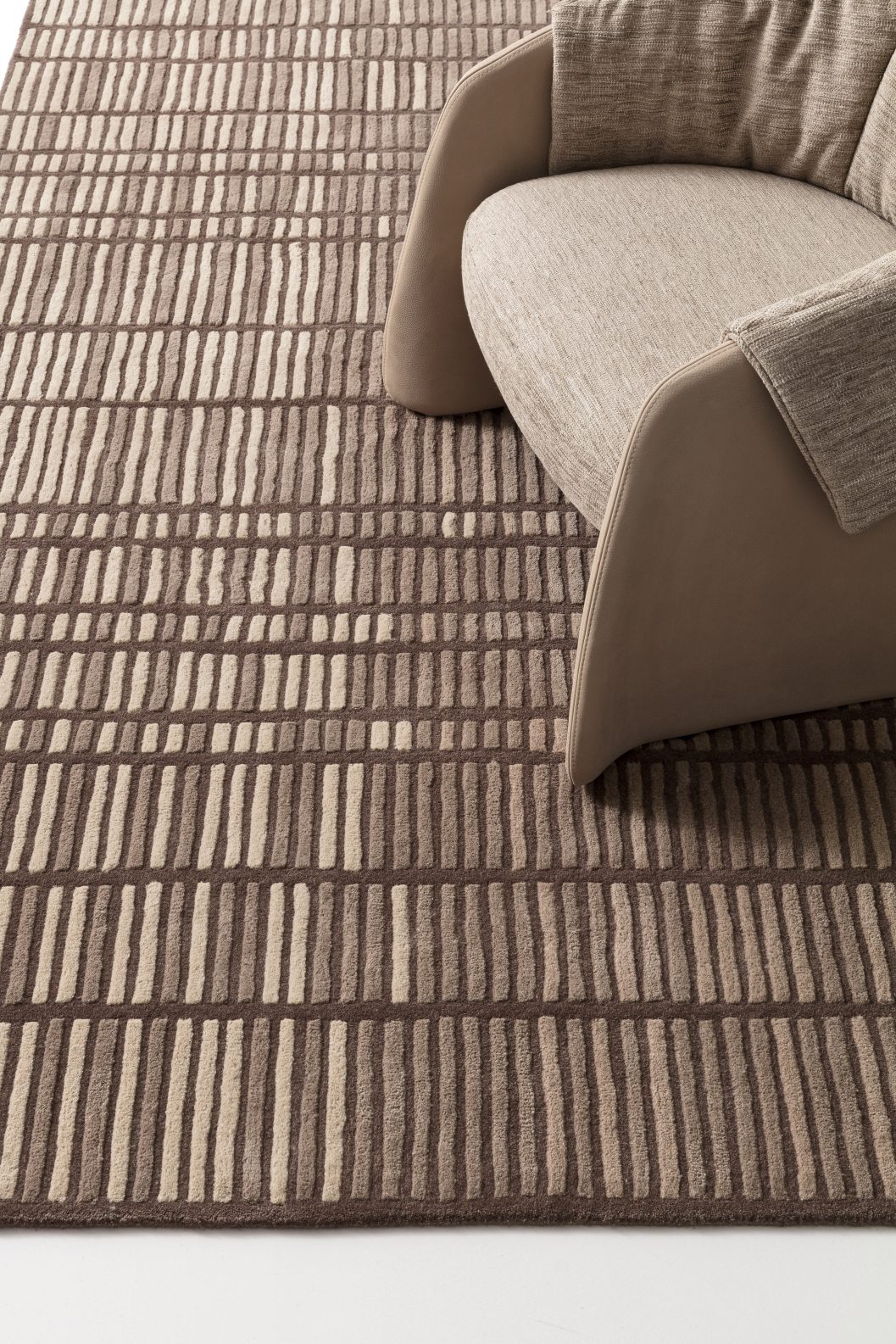 Dalla vibrazione di una traccia musicale alla sua trascrizione grafica, morbida e materica. Il disegno dai toni neutri di Hertz è enfatizzato dalla lavorazione della lana, che conferisce al tappeto un caratteristico effetto tridimensionale.