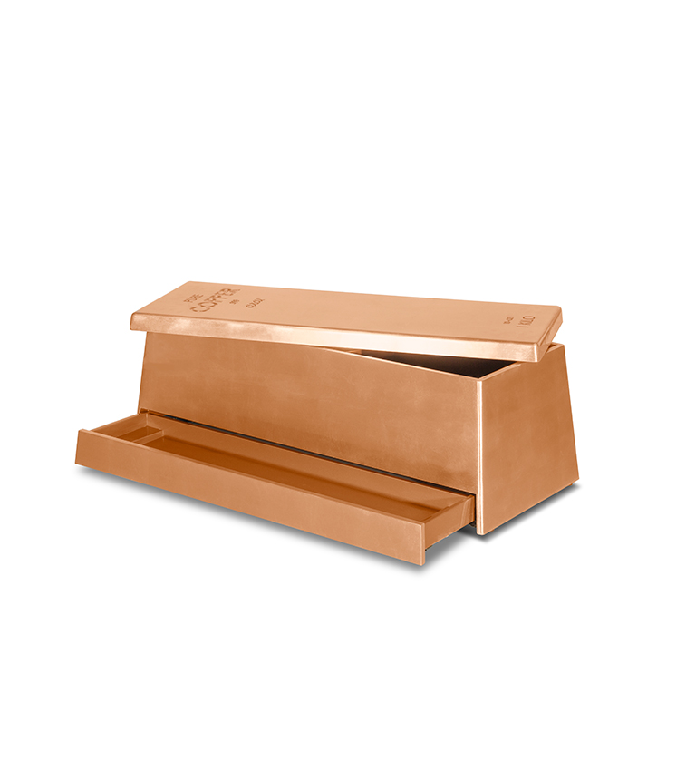 This exclusive toy box is built on wood, lacquered with metallic paint and has copper leaf finishes. It features a rotating cover and a secret compartment, for the most treasured kids’ goods.