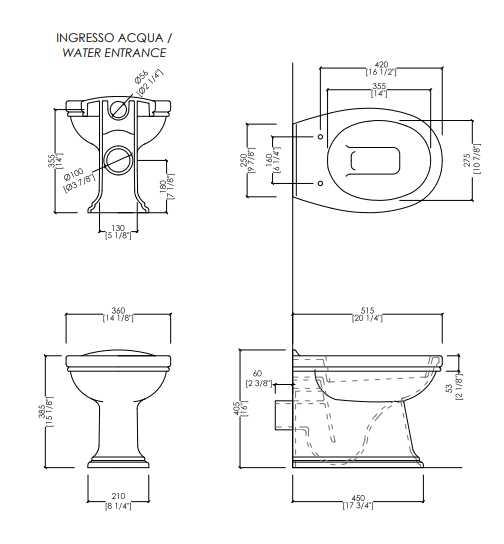 Classic lines and 1950s inspiration for a flush-wall mounted w.c. pan for in-wall cistern in fine white porcelain, which combines bon ton taste with functionality in a perfect mixture. It can be coordinated with a wide collection of seats of different materials and colours.