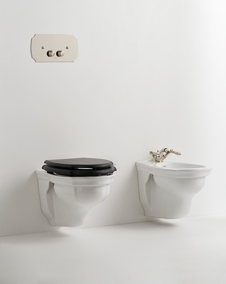 The quintessence of classicism for a wall-mounted bidet in fine white porcelain, inspired by the purest British style.