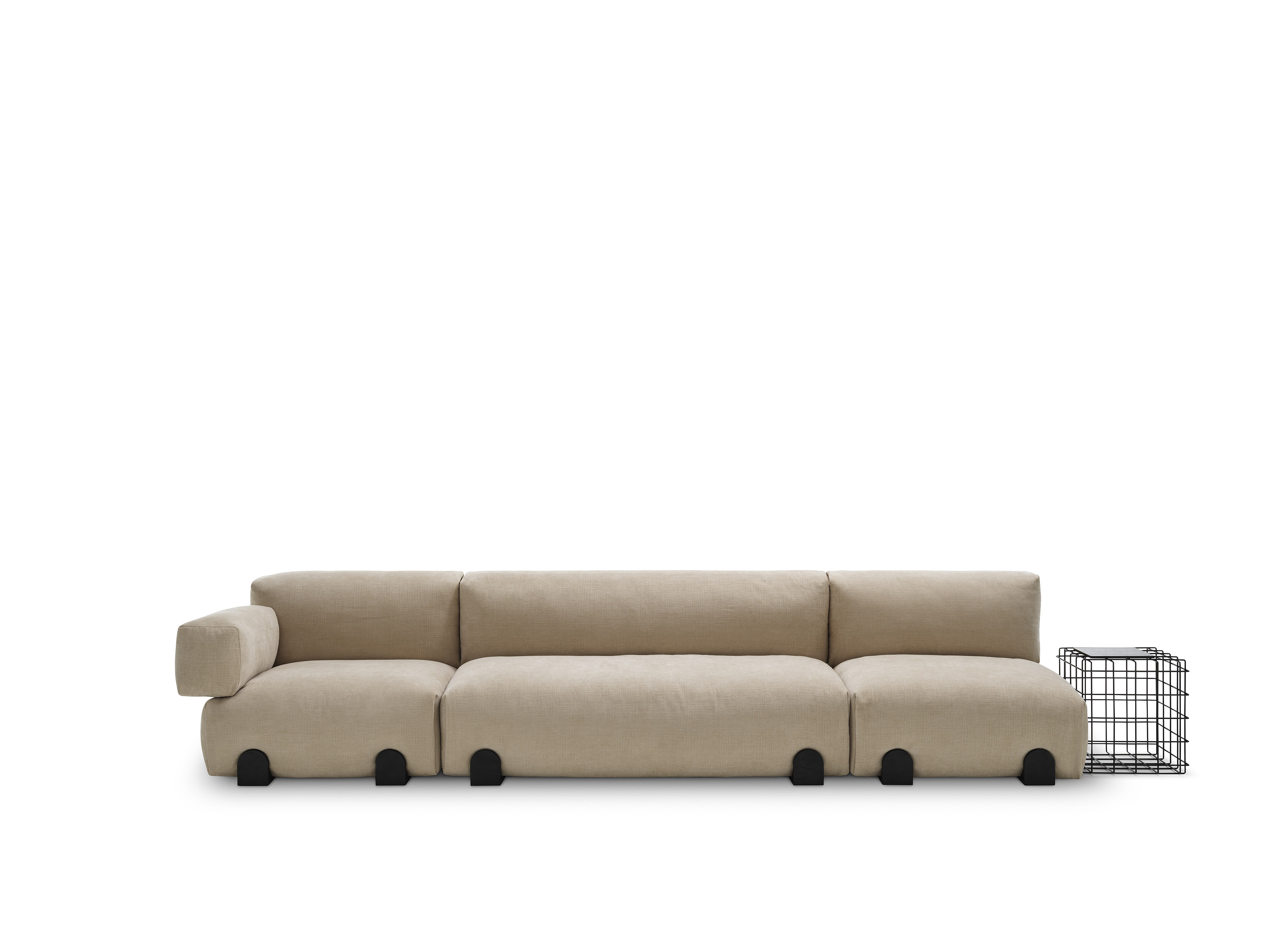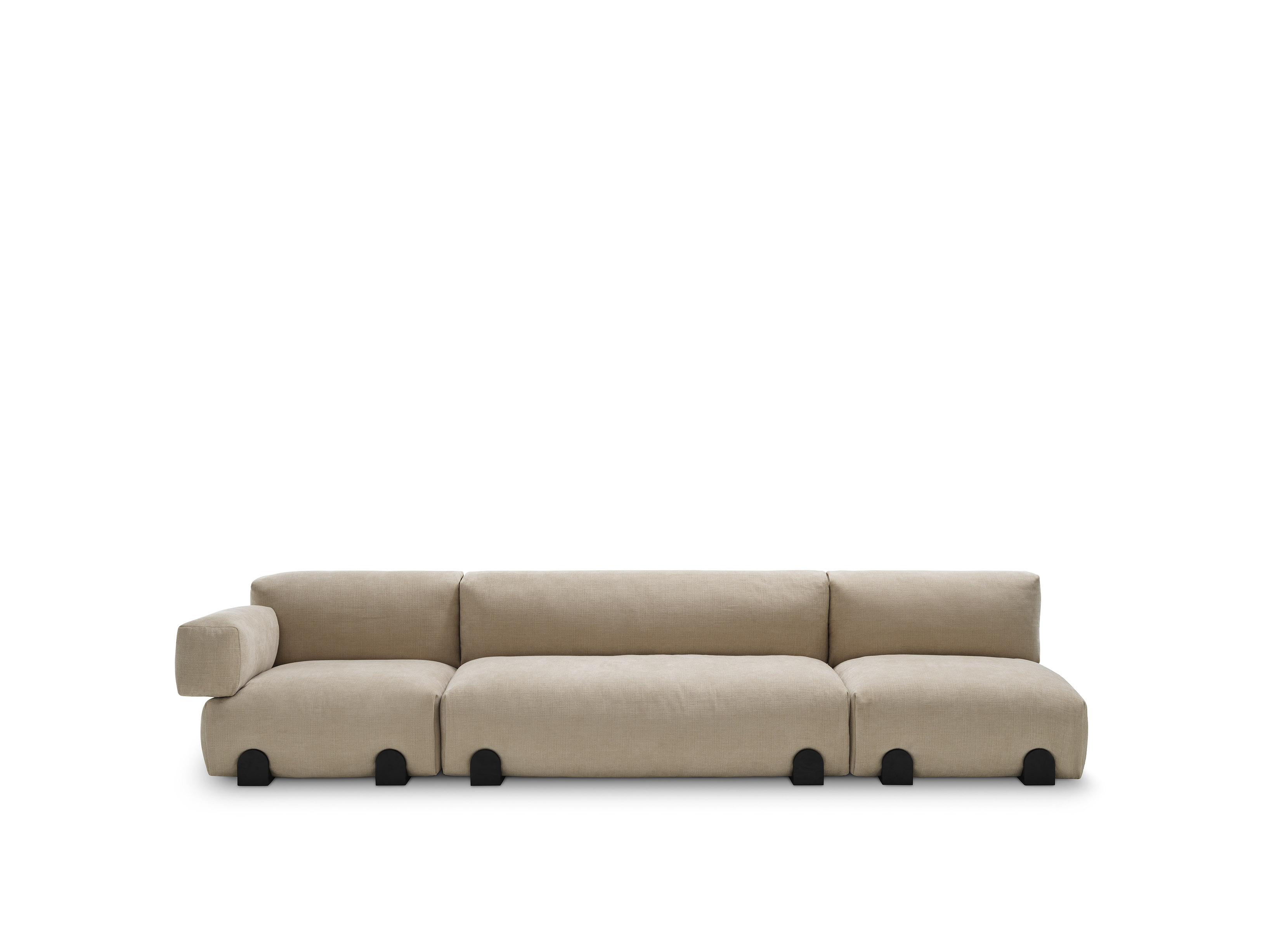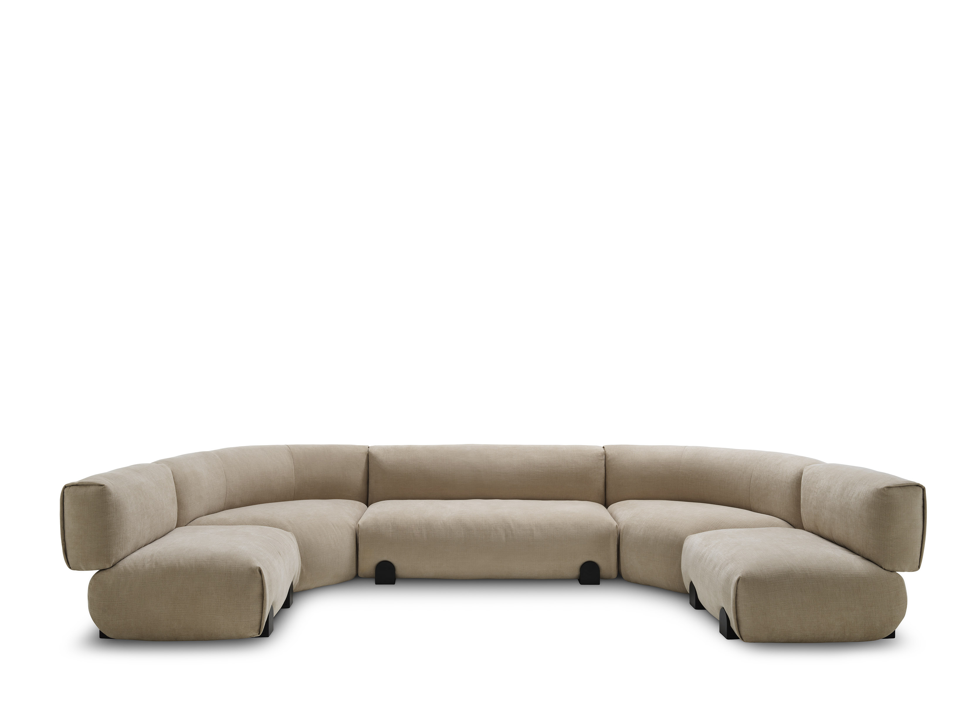 A bold upholstery has eliminated most of the seams, only a side fold defines the profile of the elements, reminiscing a Greek peplum.