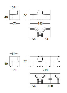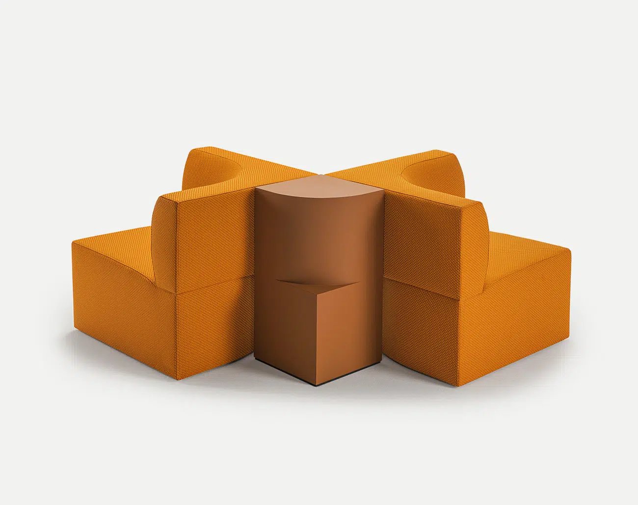 Each module seems to be sculpted directly from the rock of a quarry: a square block, solid and compact, sectioned by a curved cut to obtain two pieces that then overlap to create a backrest and seat. It is accompanied by a totemic small table. Almost a monolith, the table design also plays with angular and rounded shapes.