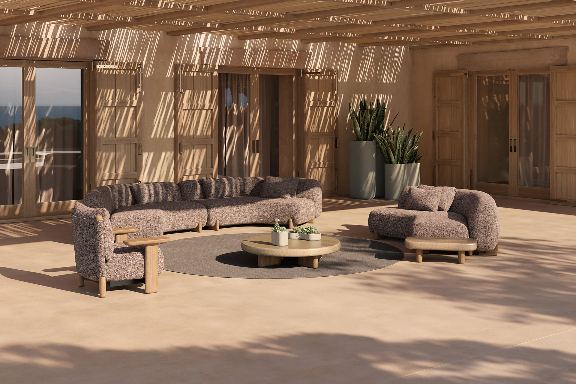This modular sofa combines the durability of flexible polyurethane foam with the natural beauty of iroko wood. Its design integrates top-quality solutions and materials, especially conceived to withstand outdoor conditions without compromising warmth and comfort.