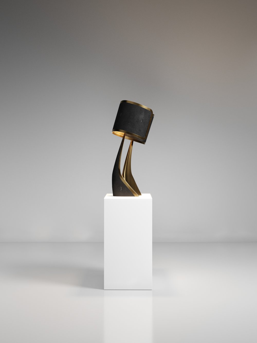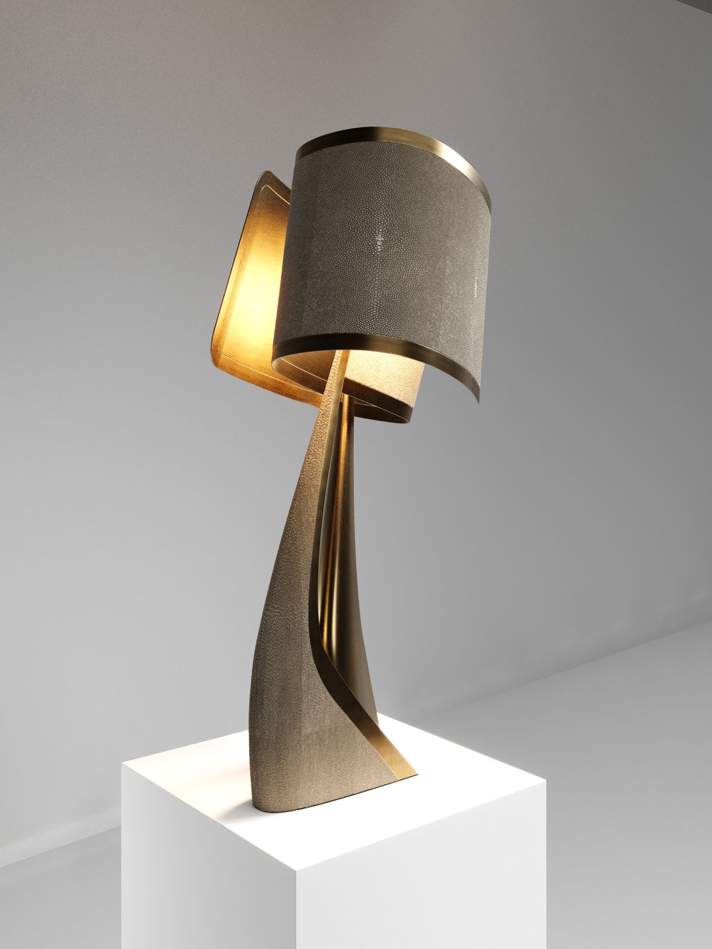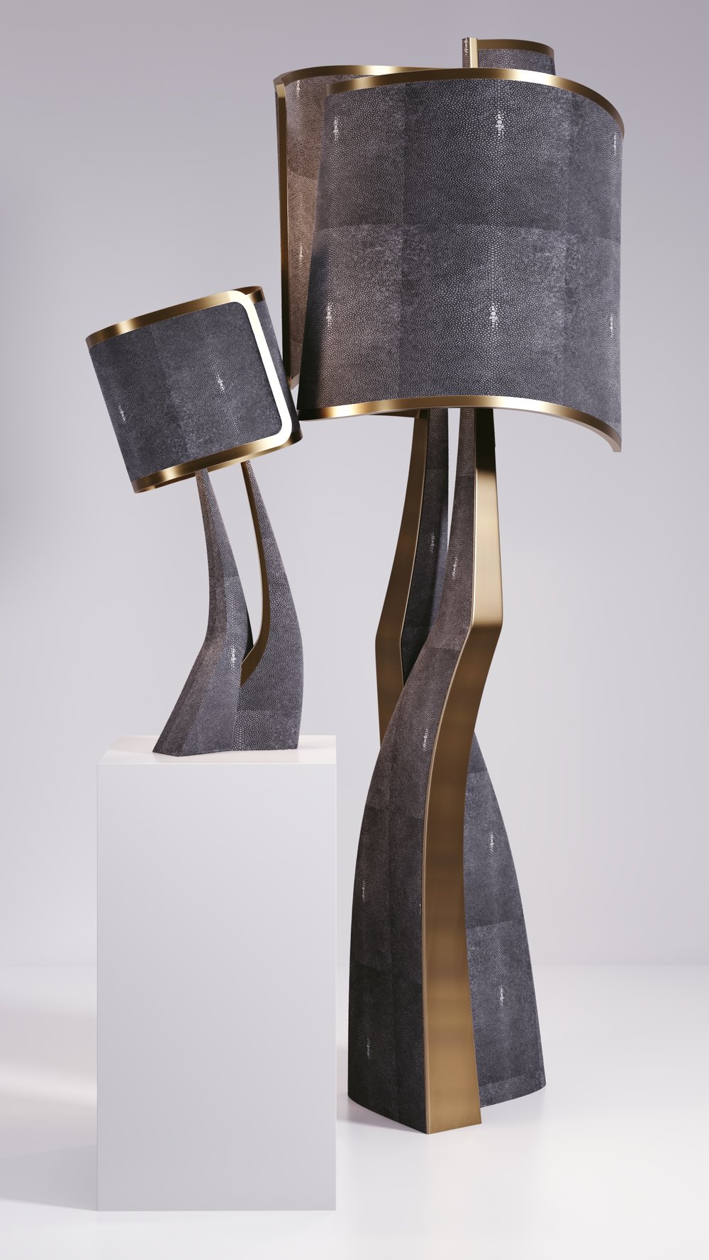 The Chital III Table Lamp by Kifu Paris is a sleek and sculptural piece, inlaid in a mixture of bronze-patina brass with shagreen or shell inlay. The chiseled legs, which are an iconic shape within the KIFU PARIS universe, morph into the solid shades that create a modern-vintage feel. This piece is designed by Kifu Augousti, the daughter of Ria and Yiouri Augousti. All shagreen pieces are hand-dyed by artisans. Available as a floor lamp, see images at end of slide