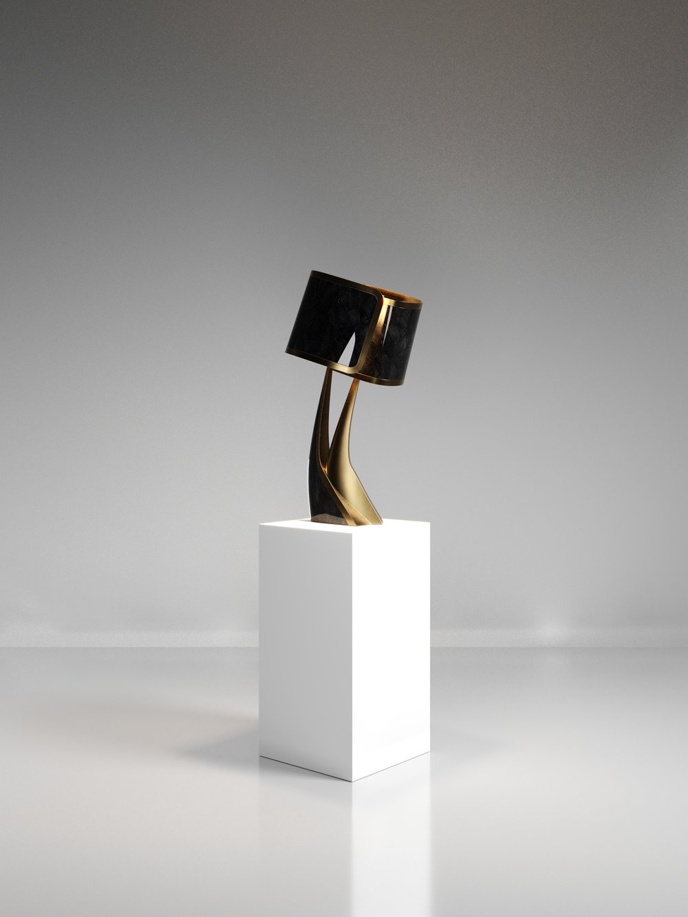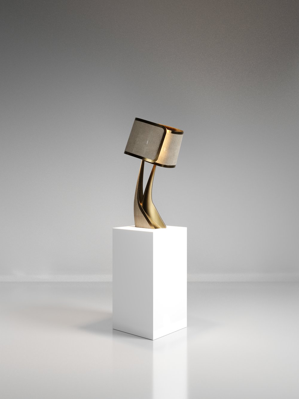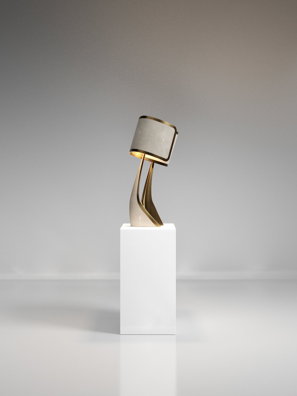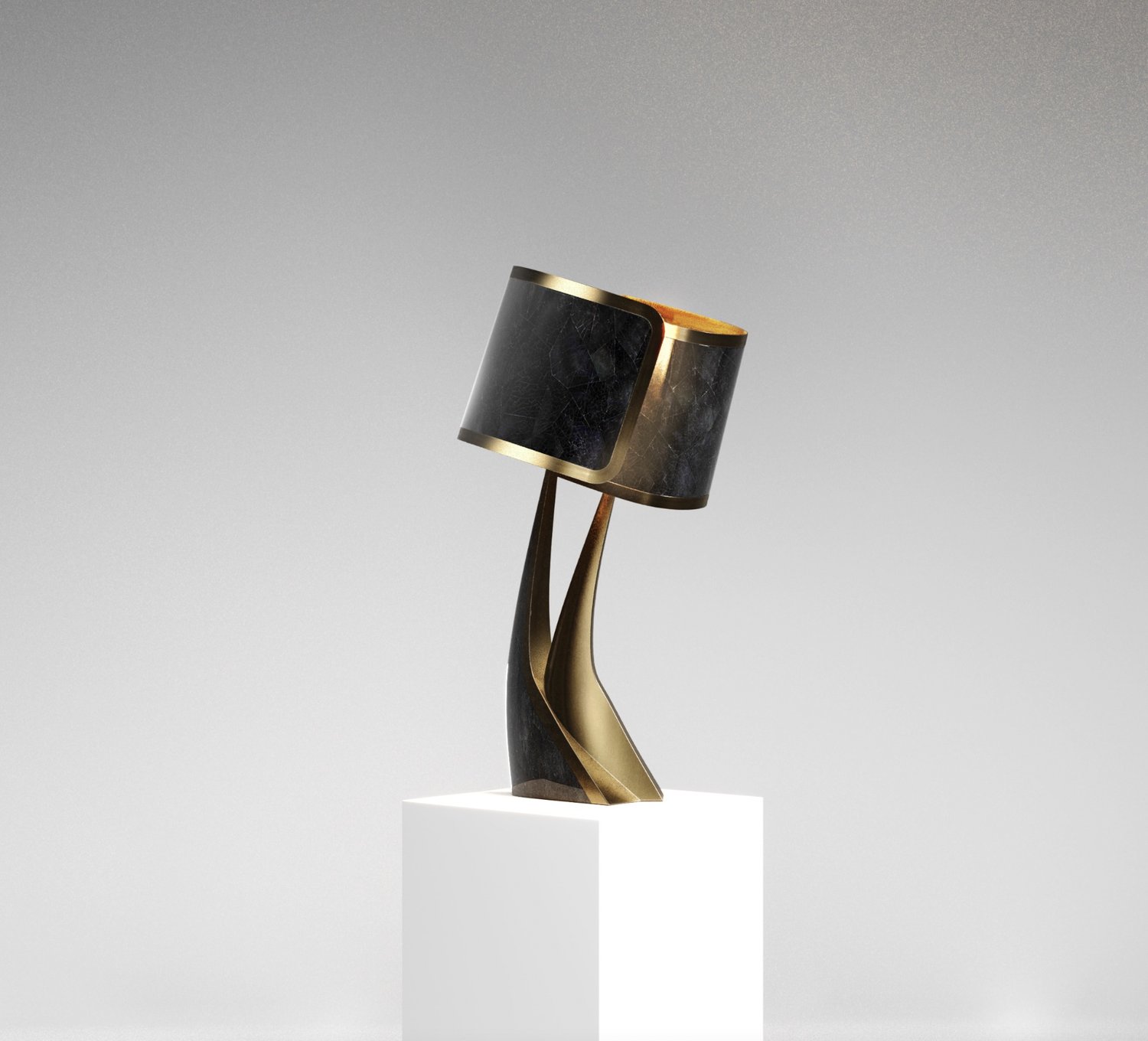 The Chital III Table Lamp by Kifu Paris is a sleek and sculptural piece, inlaid in a mixture of bronze-patina brass with shagreen or shell inlay. The chiseled legs, which are an iconic shape within the KIFU PARIS universe, morph into the solid shades that create a modern-vintage feel. This piece is designed by Kifu Augousti, the daughter of Ria and Yiouri Augousti. All shagreen pieces are hand-dyed by artisans. Available as a floor lamp, see images at end of slide