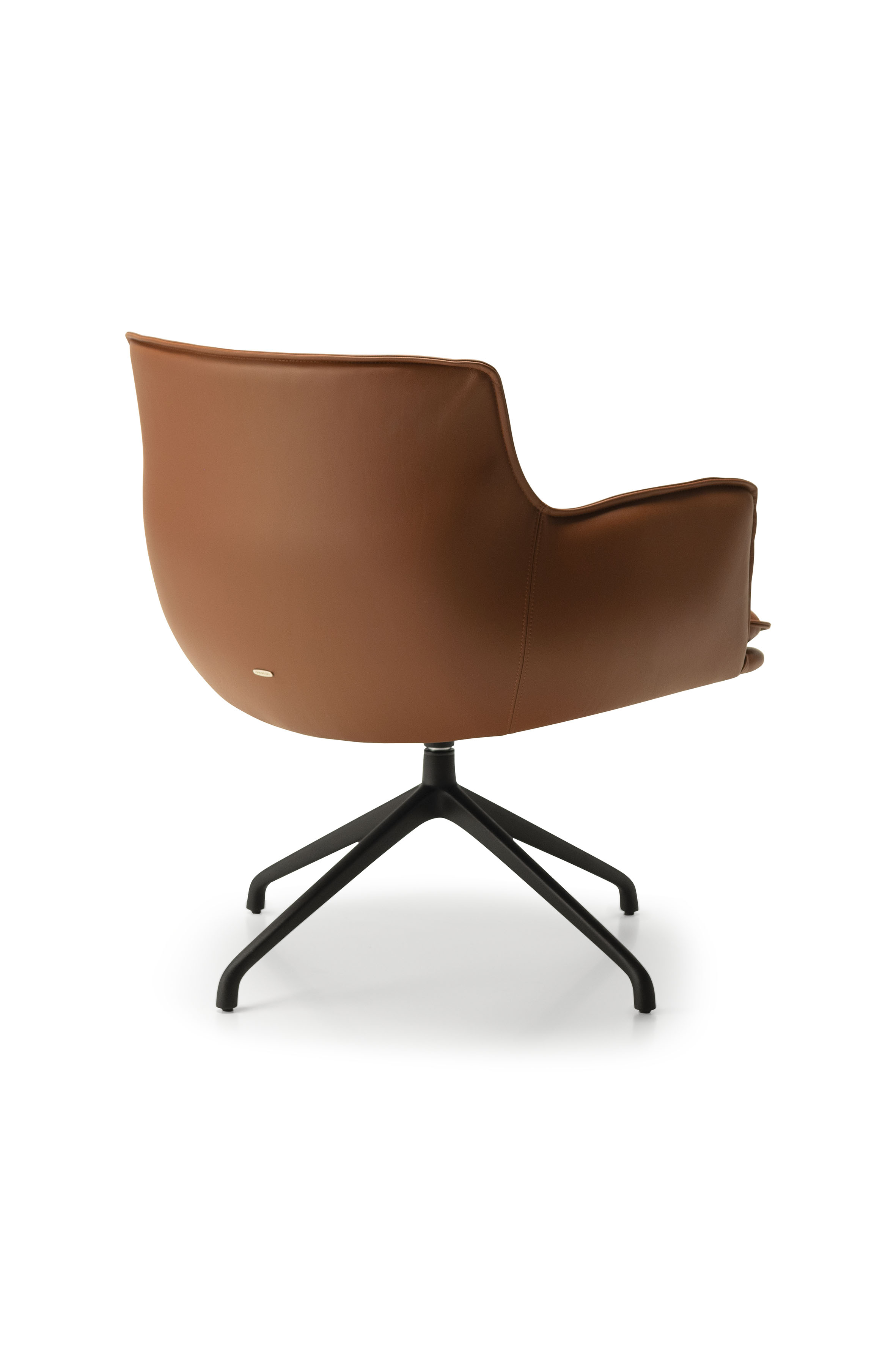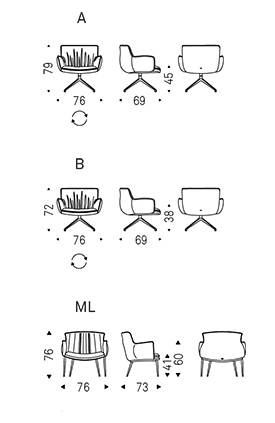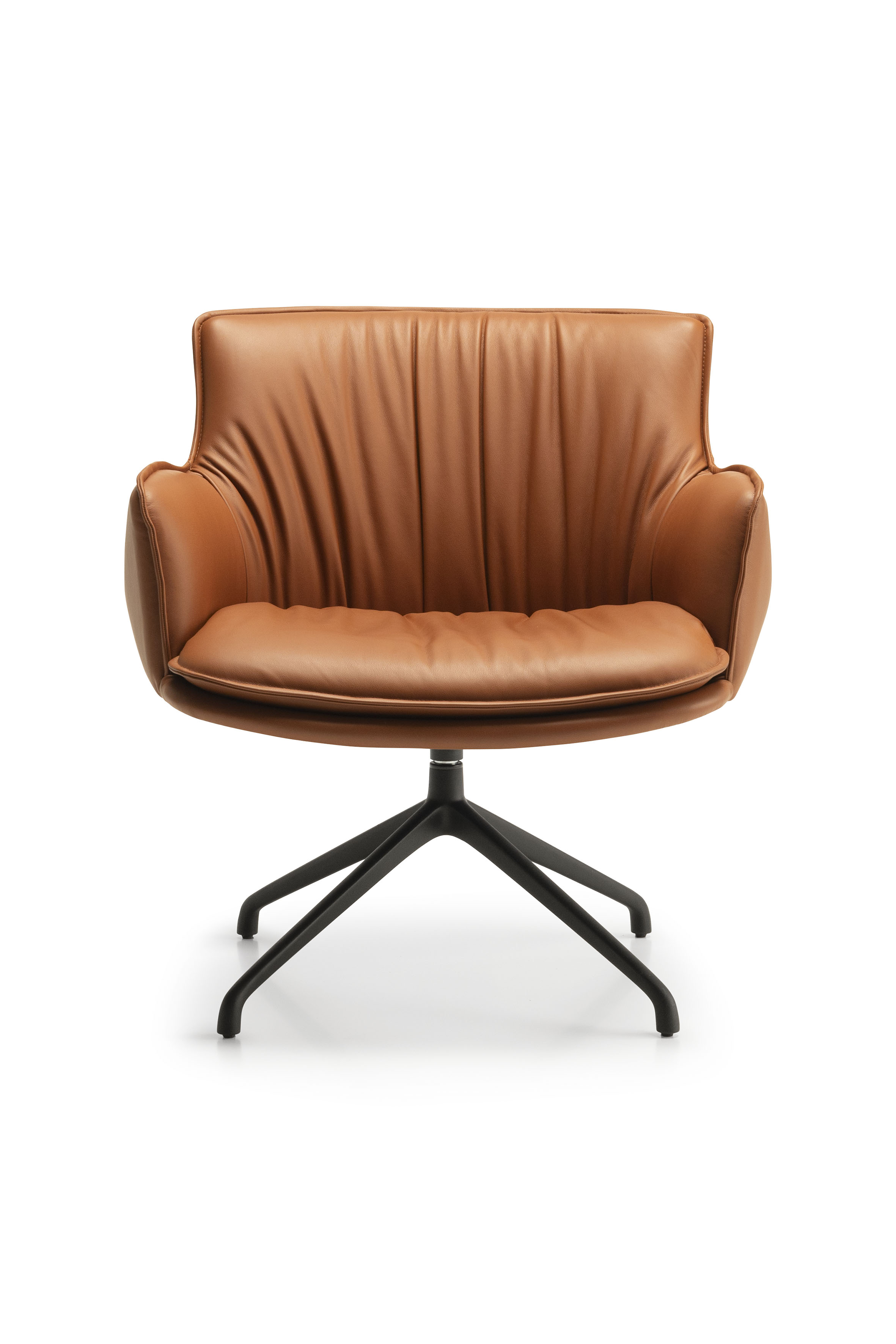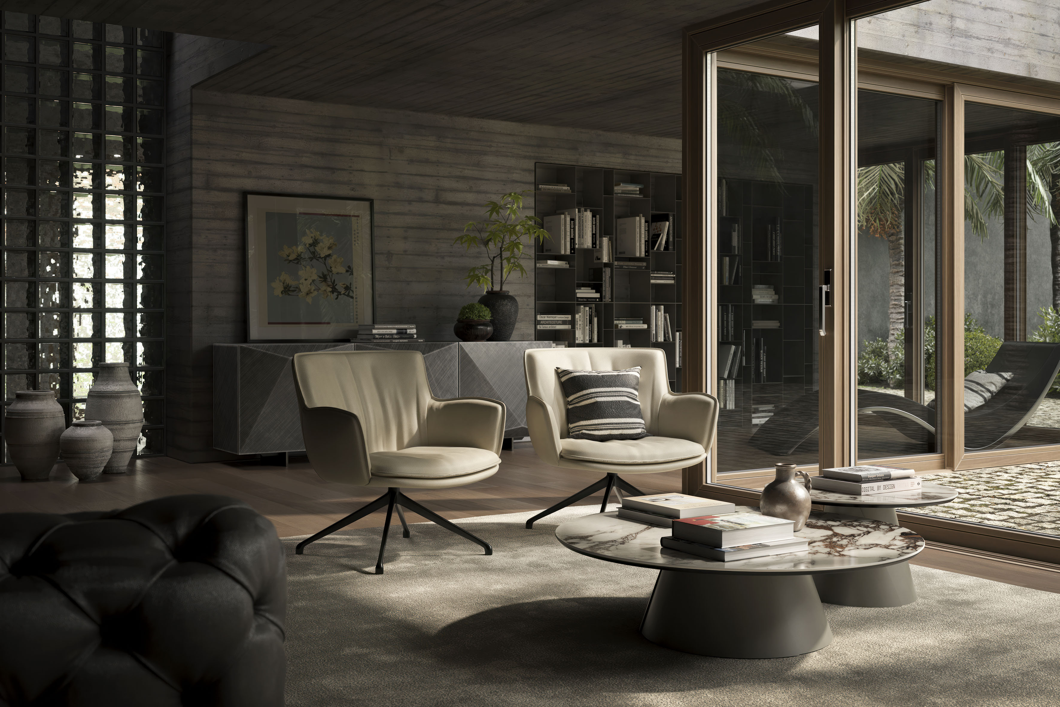 The rounded shapes in the Rhonda family of armchairs and stools exude a natural elegance that makes them ideal for furnishing comfortable and welcoming designer dining rooms. The soft folds that decorate the inside of the backrest contrast with the stretched frame that wraps around the body.