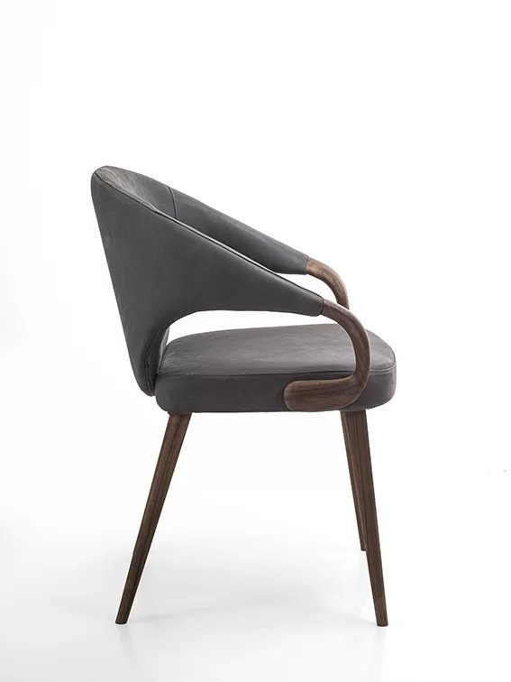 Poltroncina elegante ed avvolgente, con gambe e braccioli in legno massello. Seduta e schienale rivesti in pelle o tessuto.