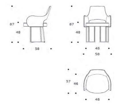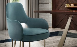 Le linee curve caratterizzano la sedia Arya: base, seduta, braccioli, schienale. Nella rotondità delle sue forme convivono confort ed eleganza.