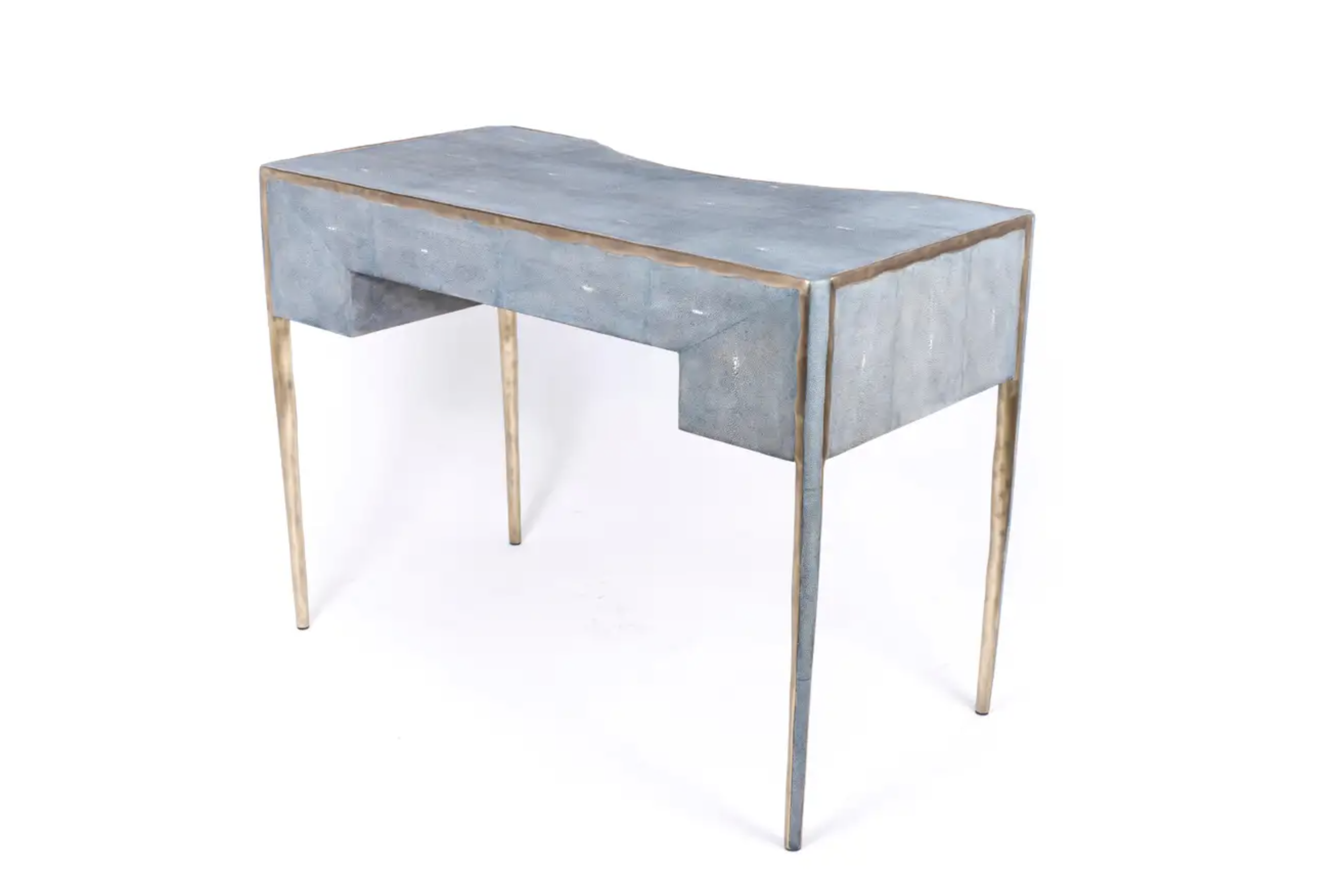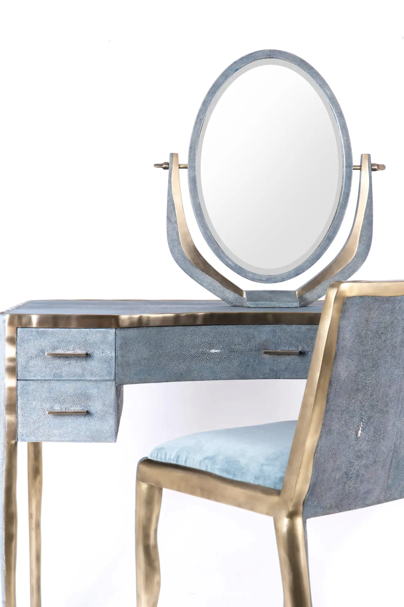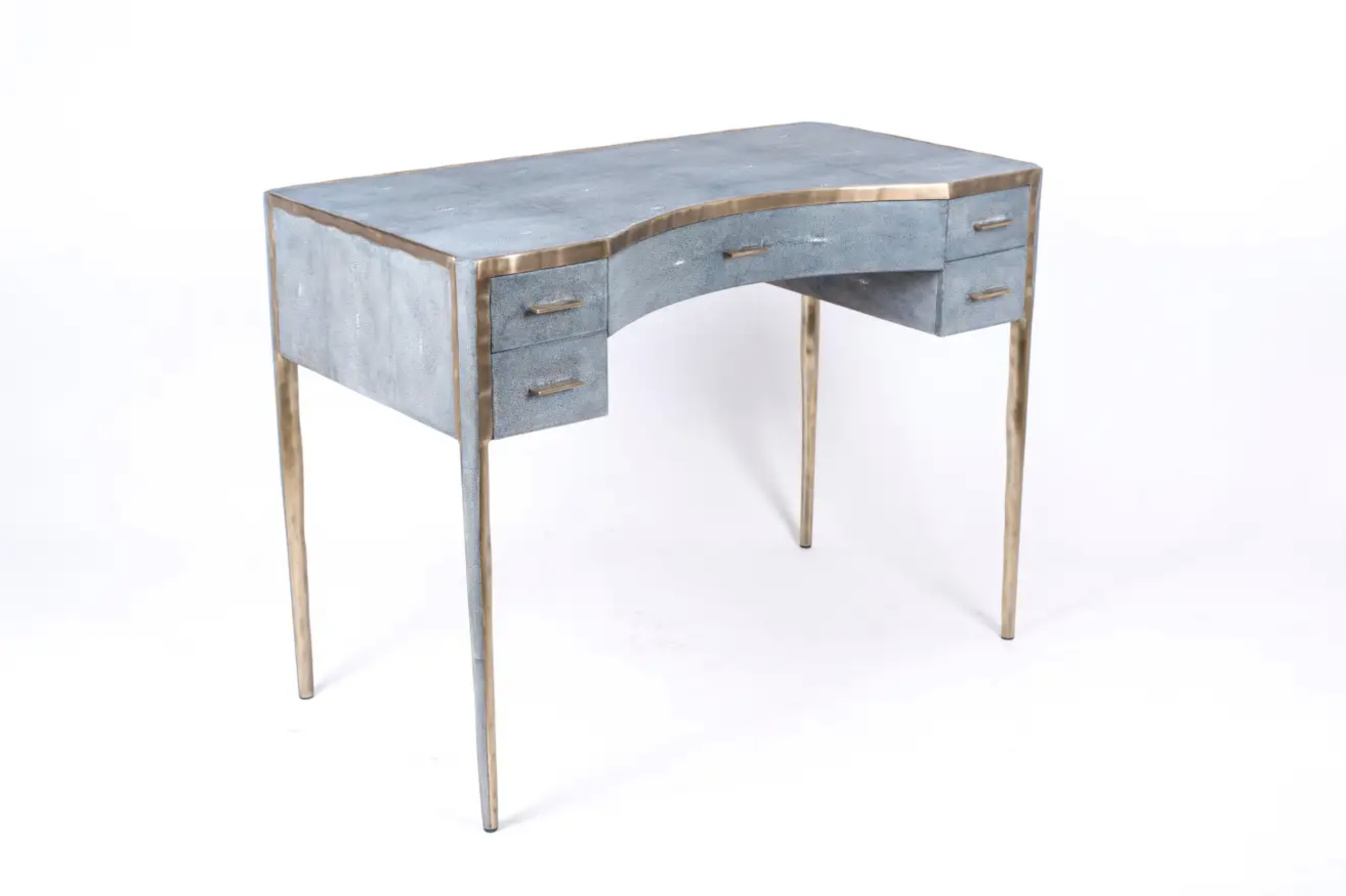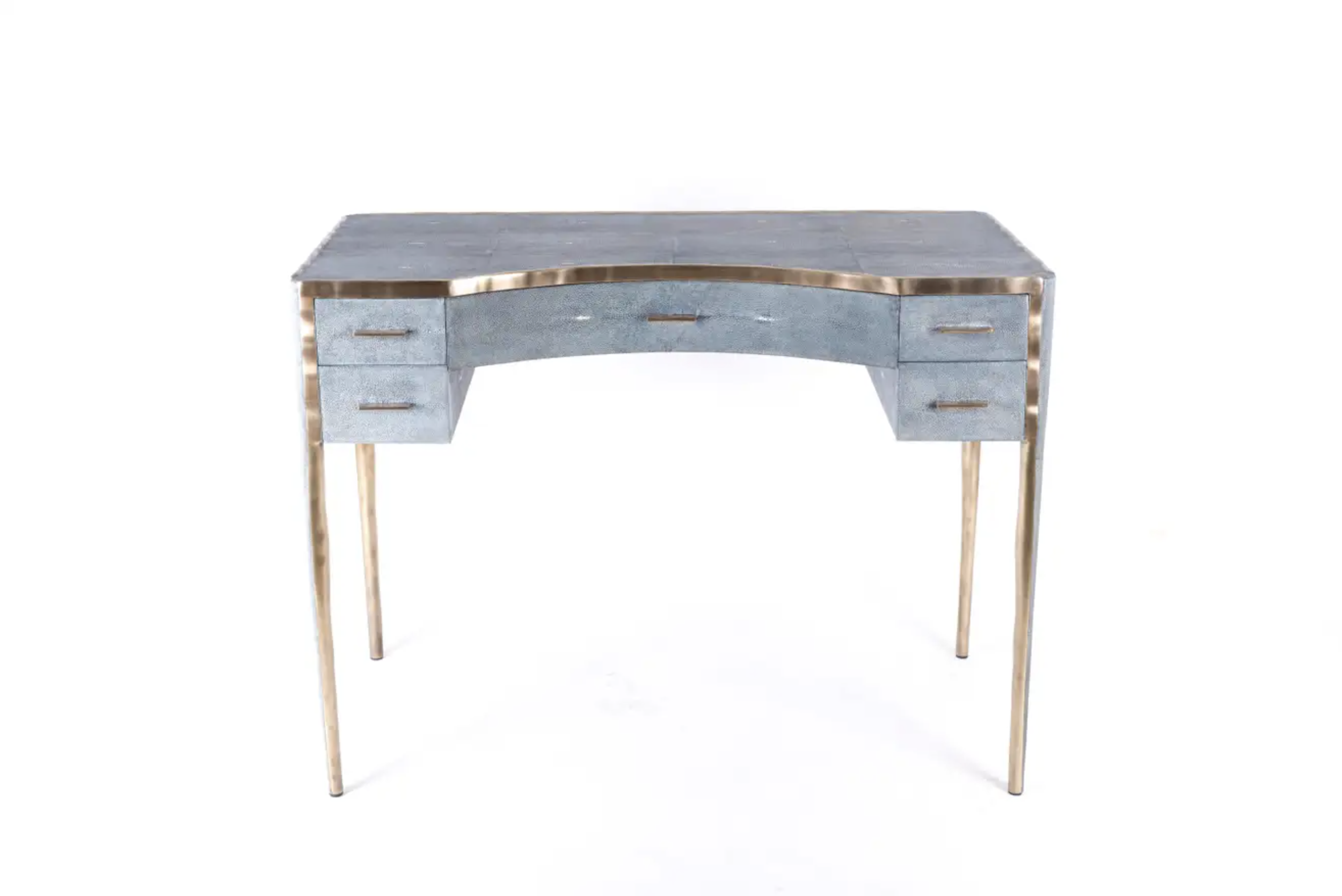 The melting vanity table's simple but elegant design, makes for an adaptable elegant piece of furniture. The blue shagreen inlaid surface is framed with an irregular surface bronze-patina brass that creates the "melting" effect against the shagreen inlay. This desk includes 5 drawers total with a discreet thin metal handle. Mirror included, chair sold separately. Custom color or sizing available on request.