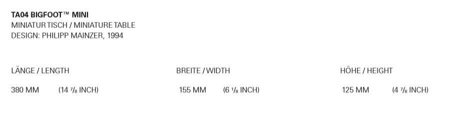The solid wood table BIGFOOT? is a modern design classic and an identifying icon for e15. The BIGFOOT? MINI features the signature corner detail and legs of the original table and is an accurate miniature on a scale of 1:6.