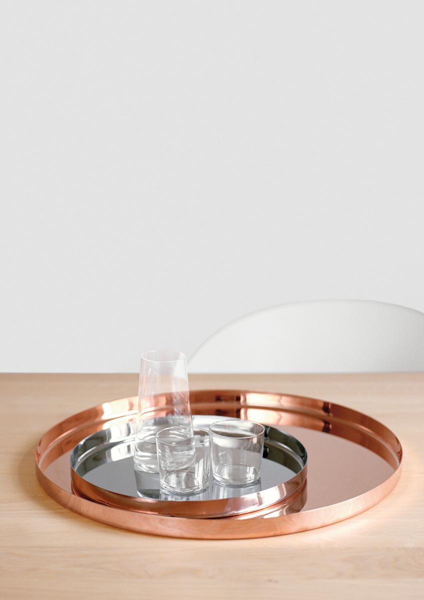 Reminiscent of ornately detailed oriental tea services, HABIBI as a tray is a precious piece offering elegant possibilities for combination. The tray HABIBI in combination with the base made from solid material can be used as an independent side table with generous diameters and optional heights available in polished brass, copper and stainless steel. Untreated by chemicals, natural oxidation processes create a beautiful patina over time, unless interrupted by applying conventional metal polishes. The surfaces are not lacquered. The endearing tray HABIBI is additionally available in powder-coated aluminium in jet black.