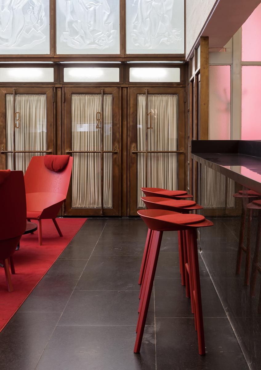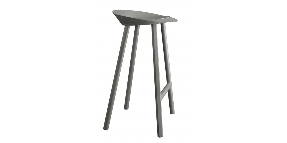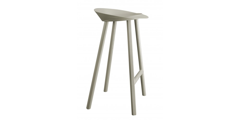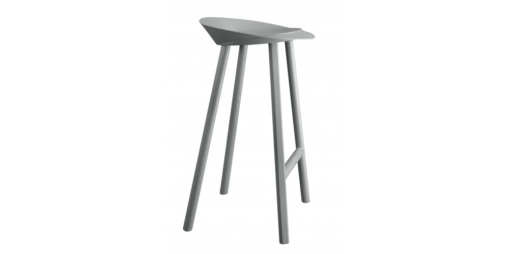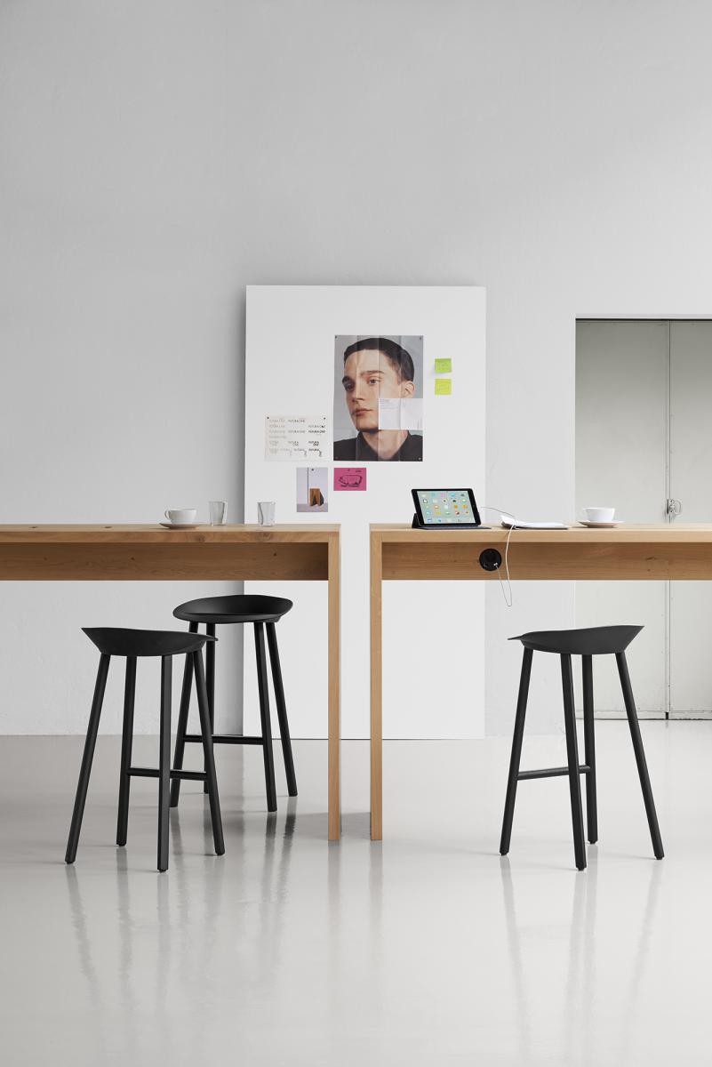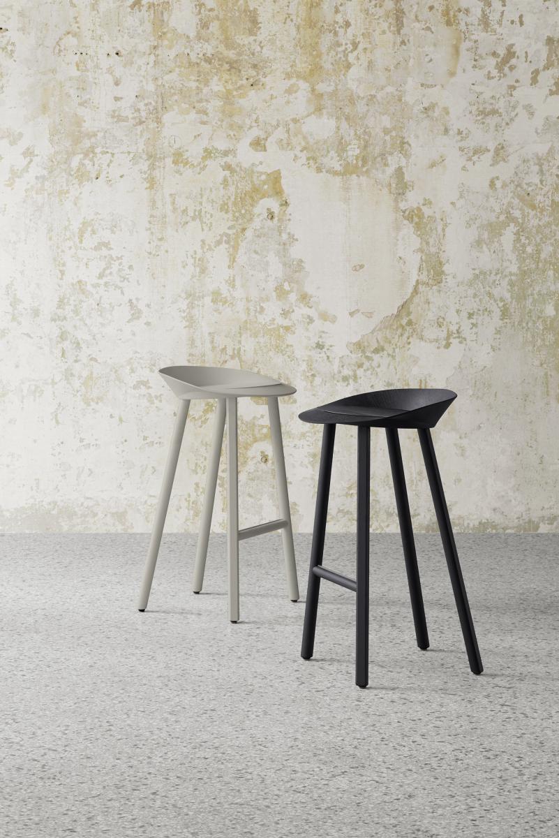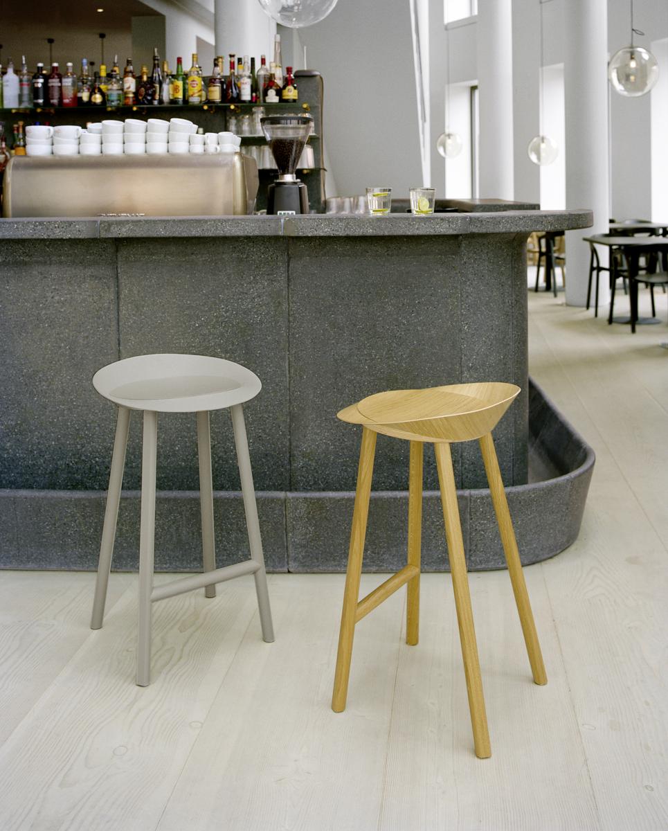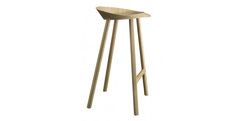 The bar stool JEAN is a natural development of the dynamic chair family HOUDINI. JEAN consists of a seat with circumferential brim, which provides comfort and hold when seated. Between the front two legs runs a cross beam with an embedded metal profile, which acts as a foot rest and gives the stool stability. The bar stool JEAN, made from lacquered oak veneered plywood, is available in two heights which makes it suitable for contract as well as private use, for example at a kitchen counter. Upholstery of the seat is possible.