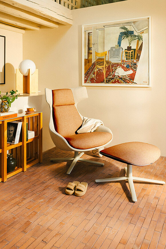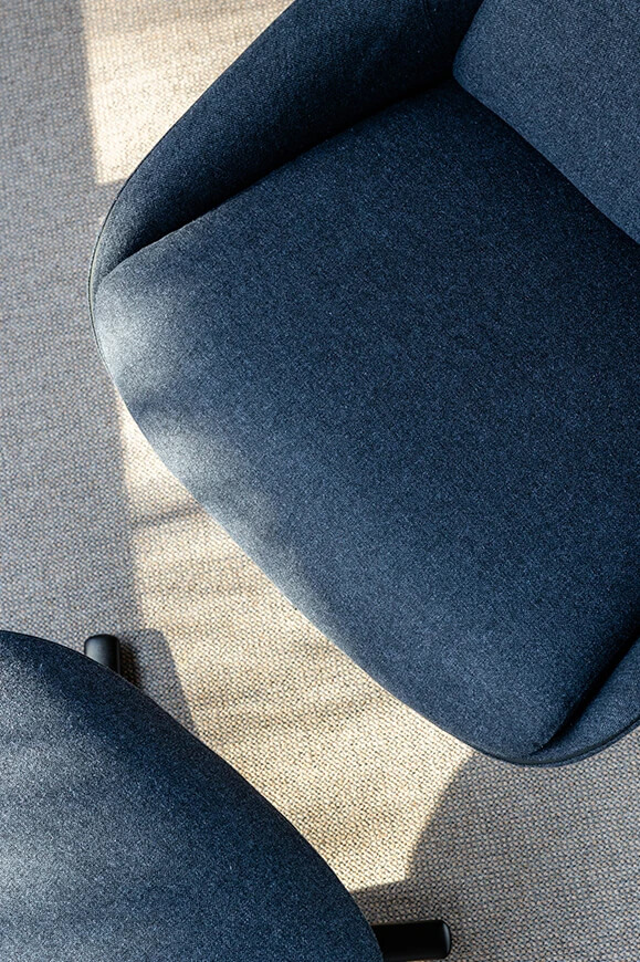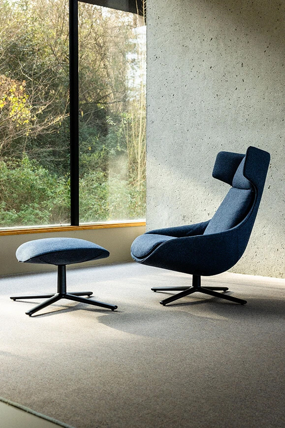 The Kua 4R ottoman features a fully upholstered seat and a fixed four-star aluminium base, which can be polished or lacquered in any of our colours. It is the ideal complement as a footrest for the armchair from the same collection. This piece certainly has a place in the home, in waiting rooms in the hospitality sector, and in corporate environments.