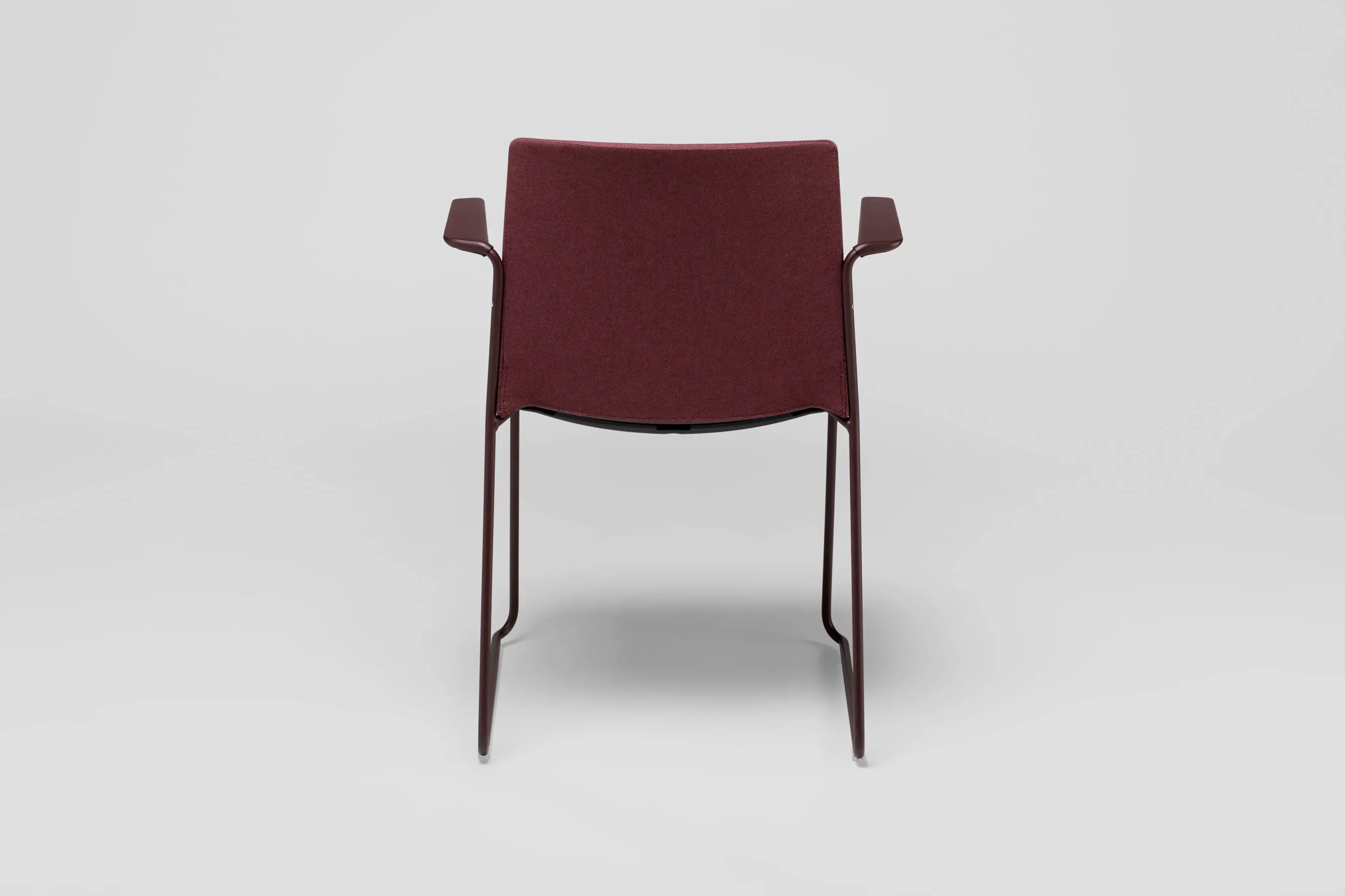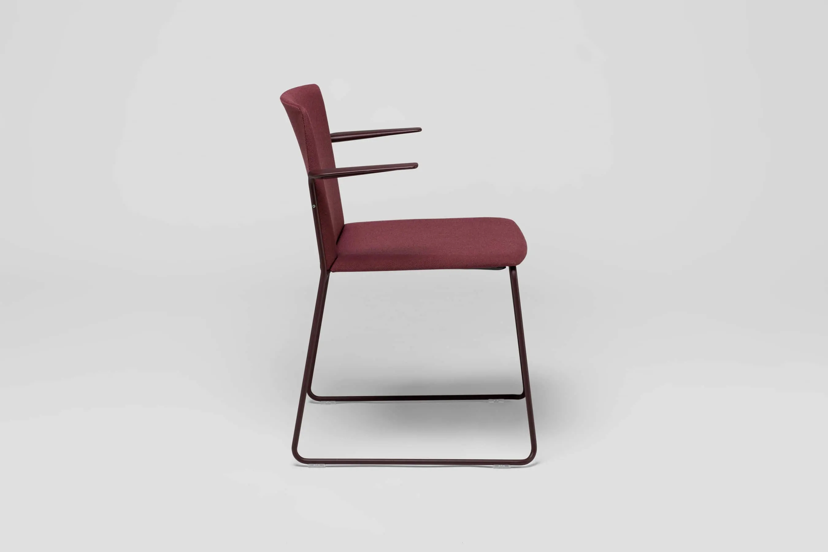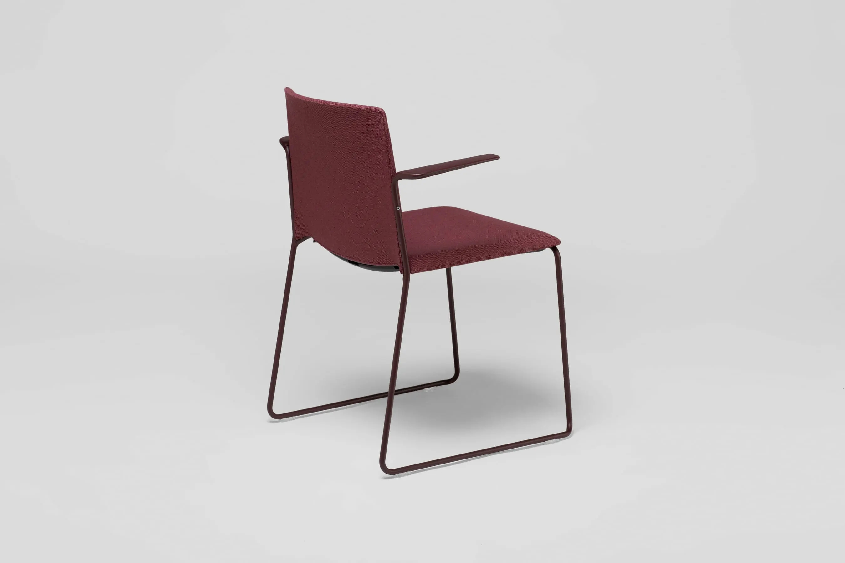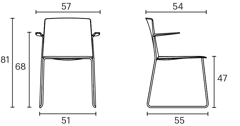 Ema chair with closed backrest and arms is strong, lightweight and high stackable and its closed back makes cozier than the open back. This model also allows to stack up to 45 units, what makes it perfect for all kinds of spaces, in special for contract sector. The sledge steel structure and the aluminium arms can be chromed/polished or lacquered in any of our colours and the seat and backrest are available in polypropylene or upholstered. Besides, it has an upholstered seat pad available, which is very useful for multipurpose or crowded spaces, improving stacking by causing less friction than the full upholstery version. In this case, the stackability reaches up to 20 units on the trolley and 15 units on the floor.