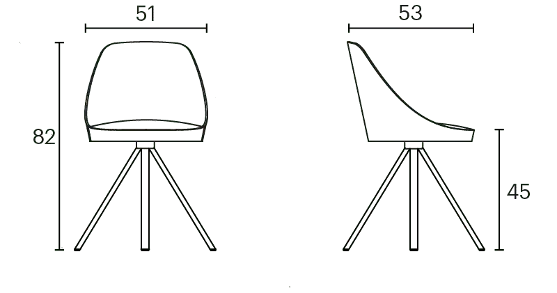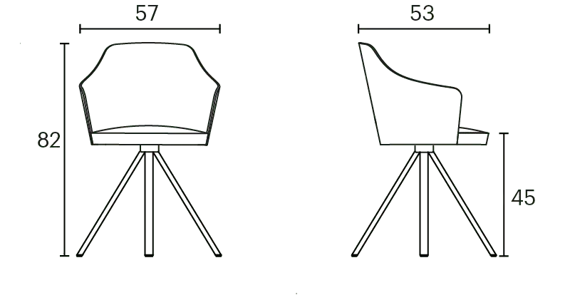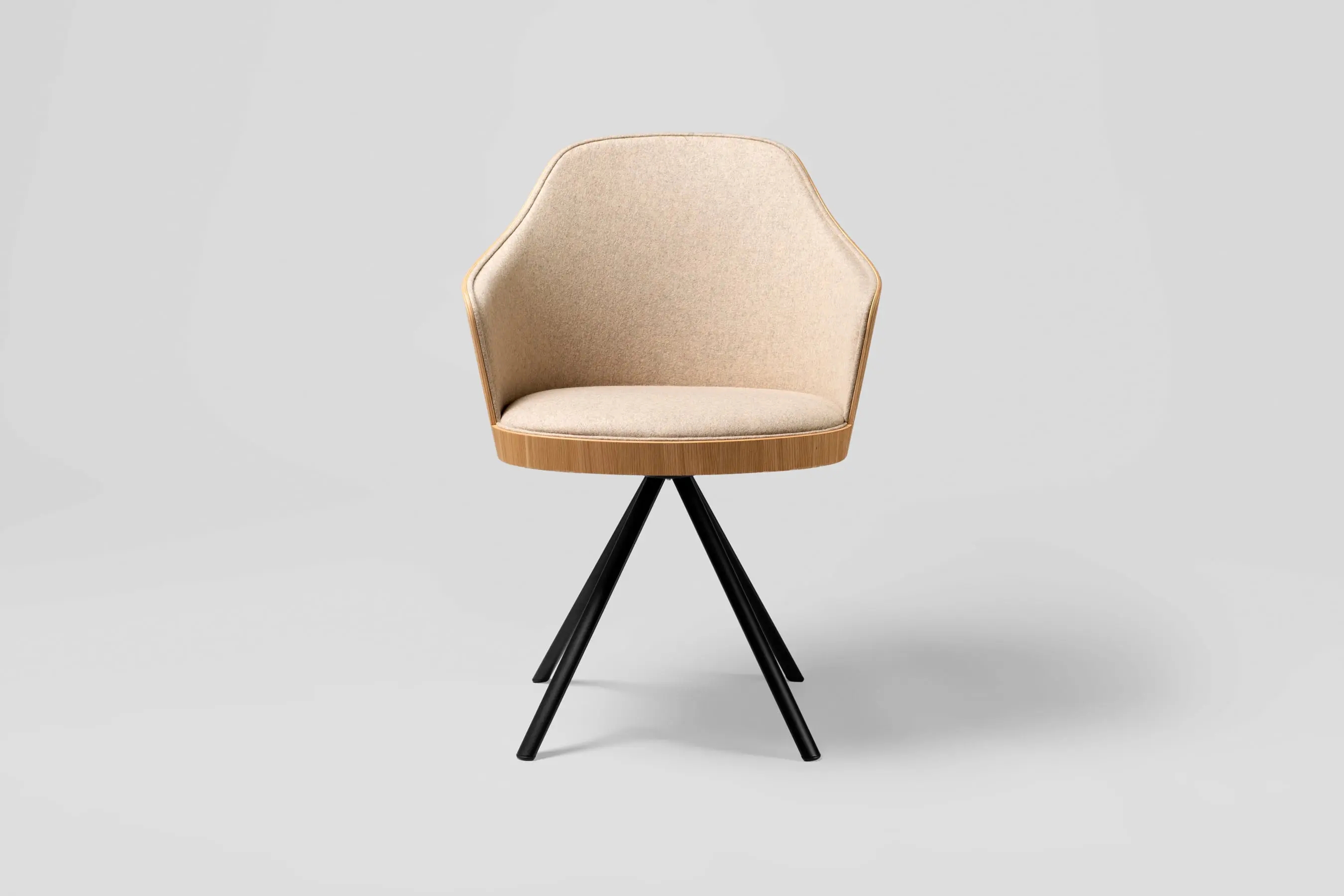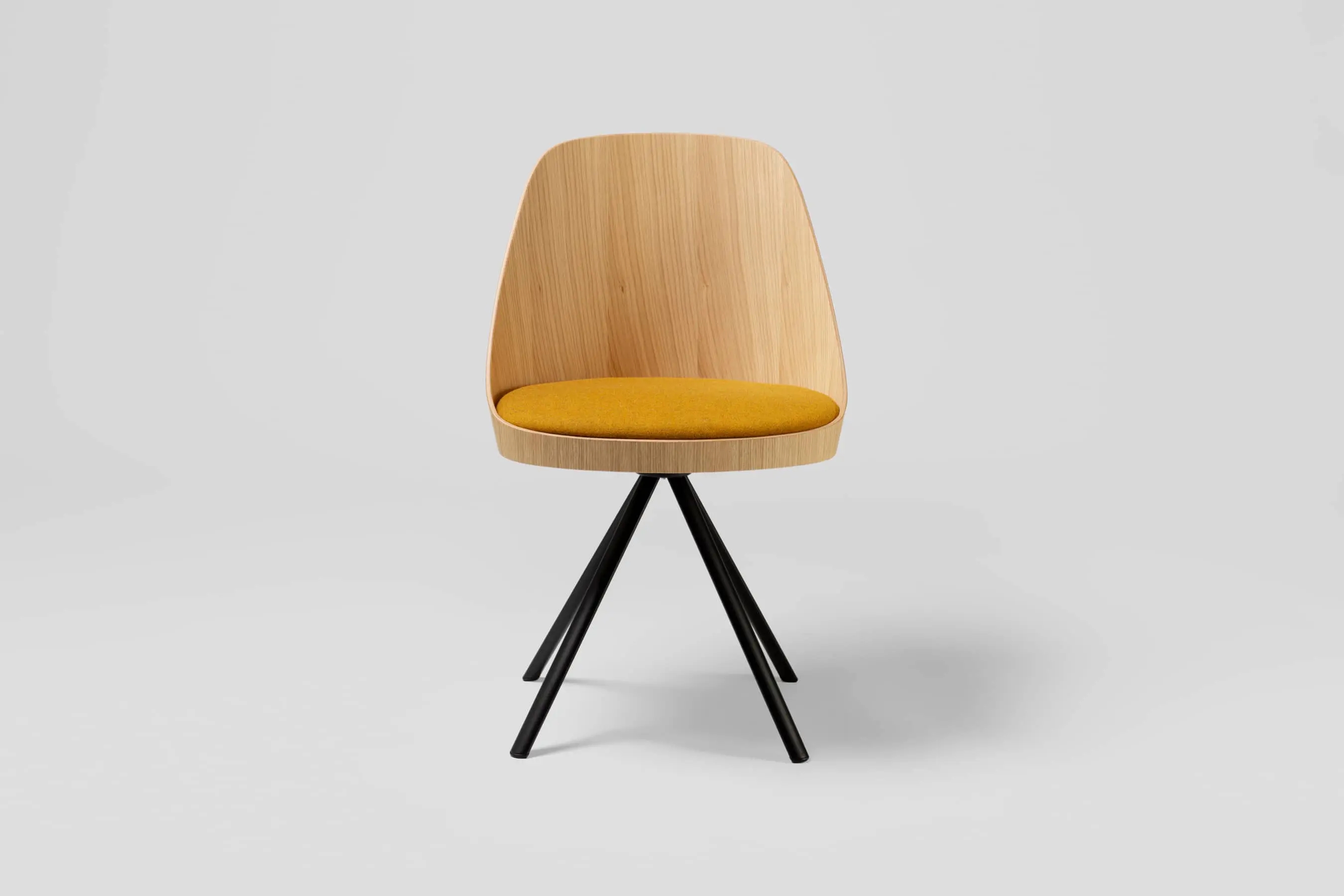 The shell of Kaiak spin chair is made of natural or stained oak wood and it has a broad range of upholstery options available: fully upholstered, upholstered seat, three quarters upholstered and inside upholstery. Thanks to its 4-legged lacquered steel structure, the chair can be swivel or fixed.