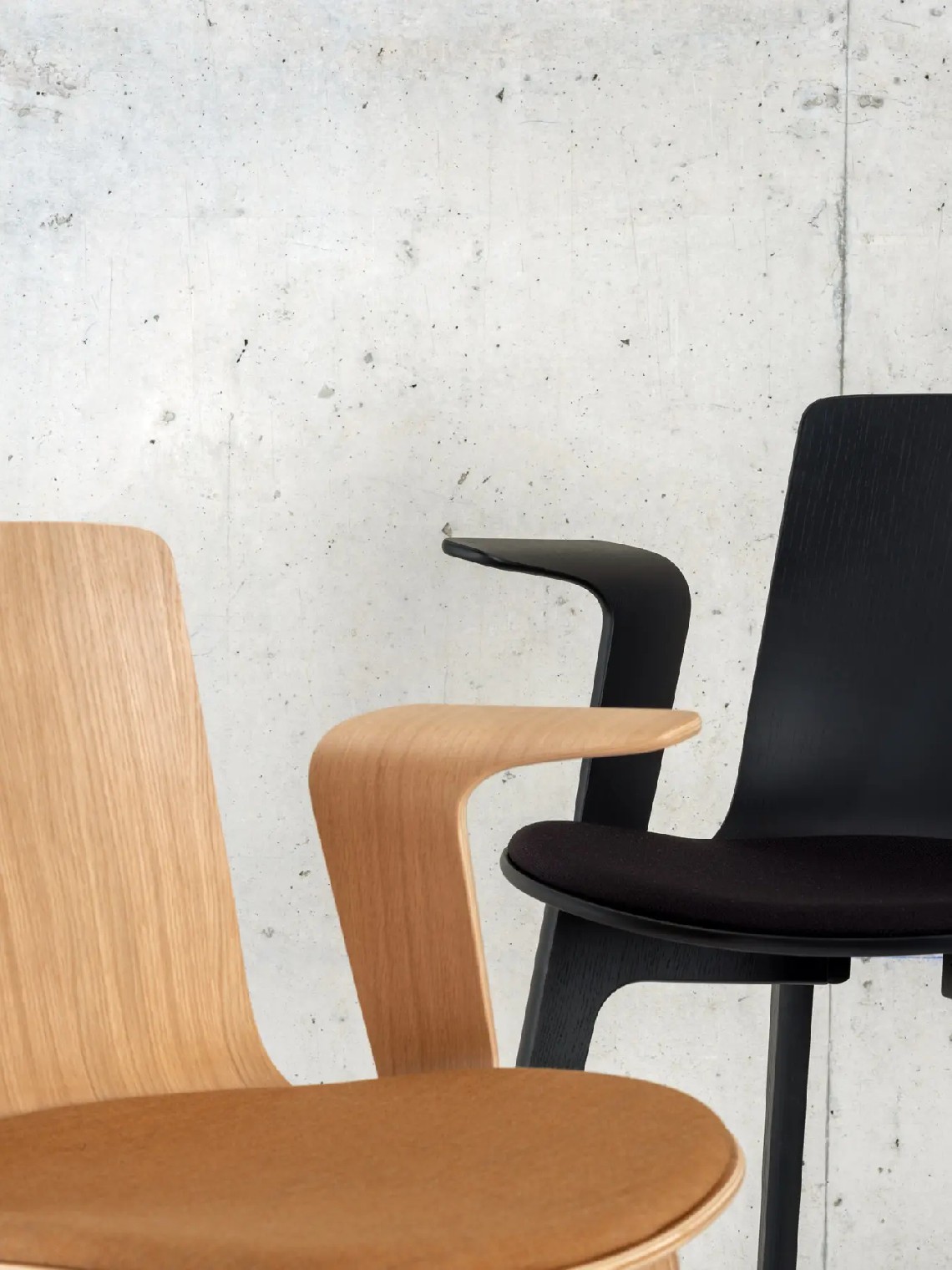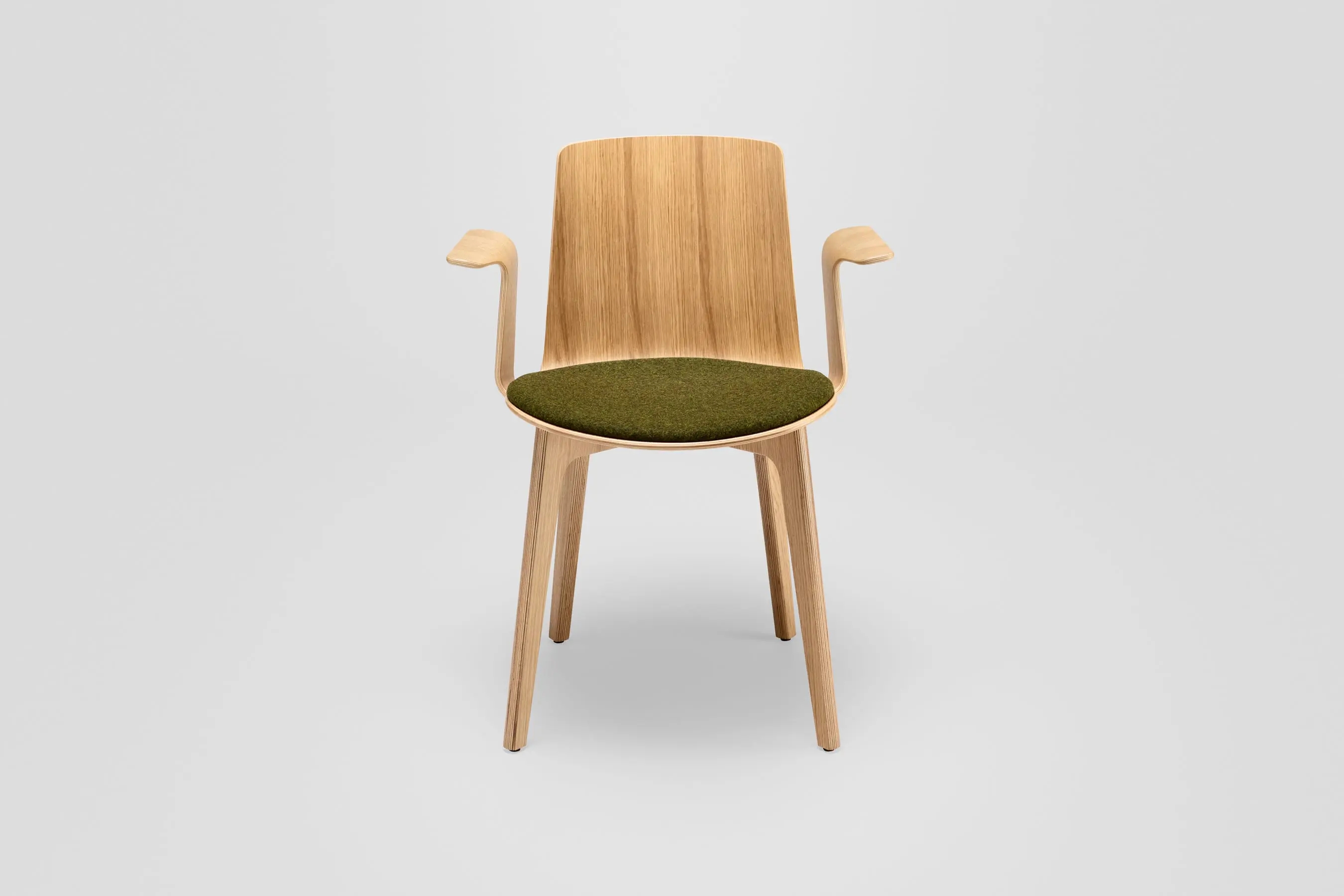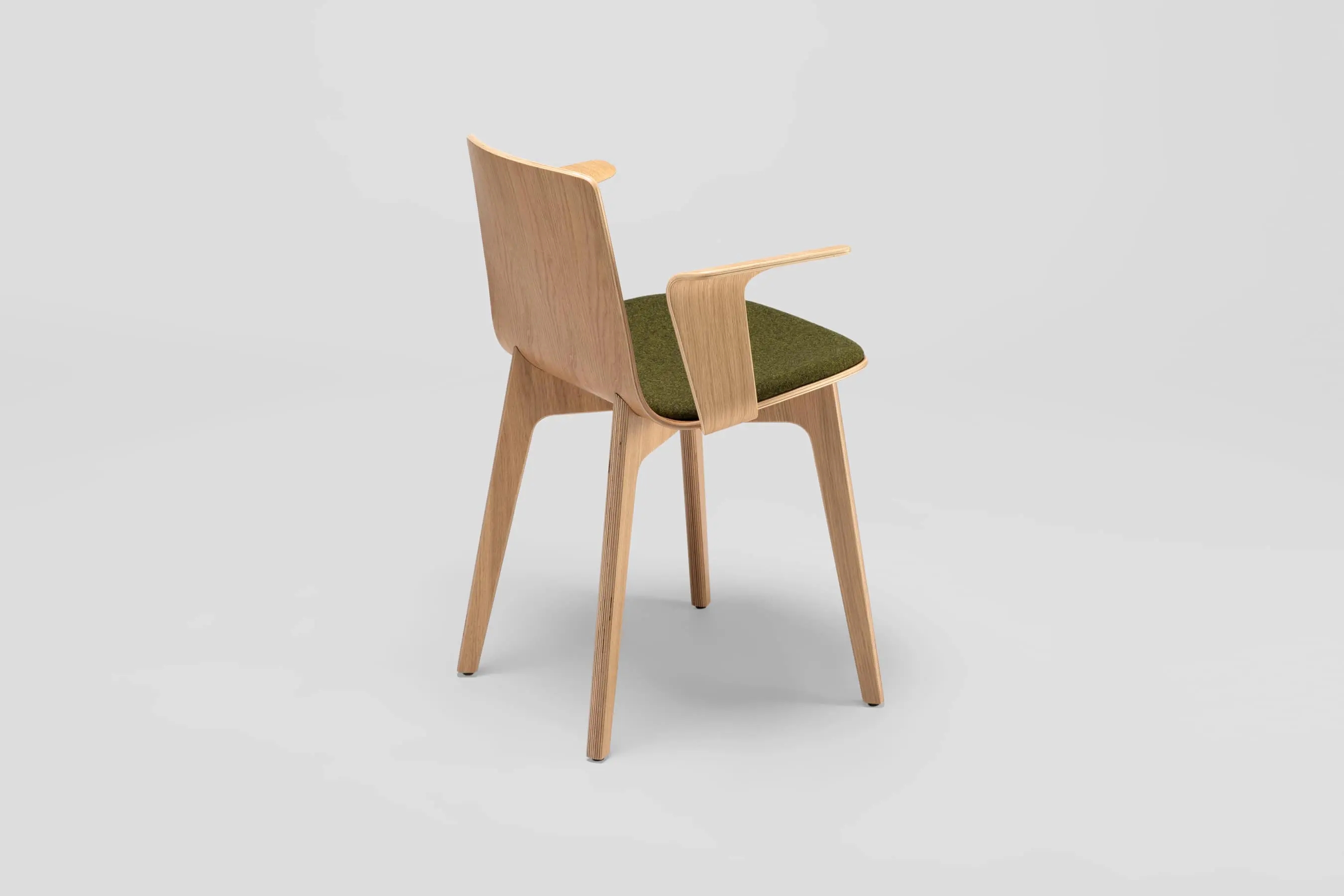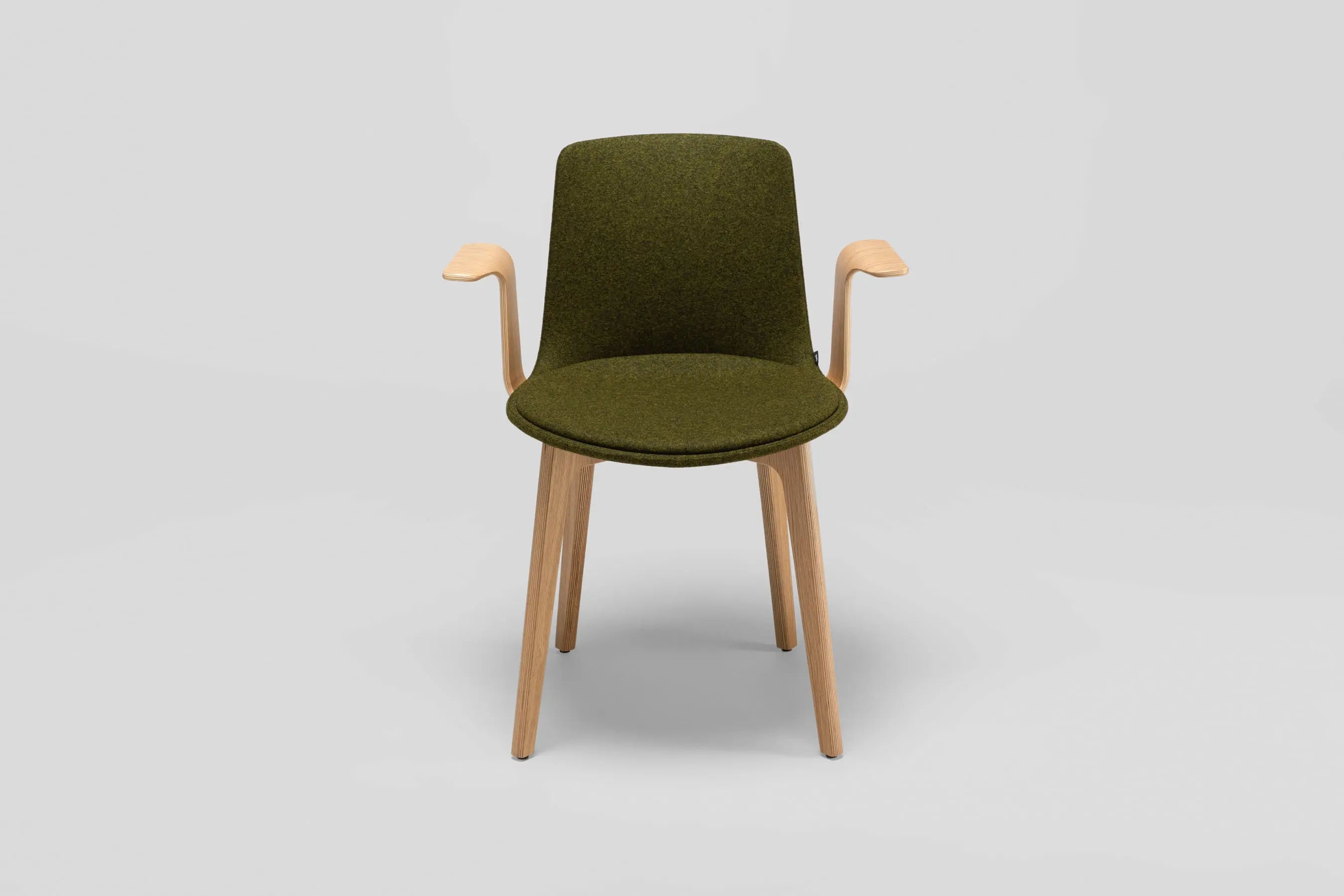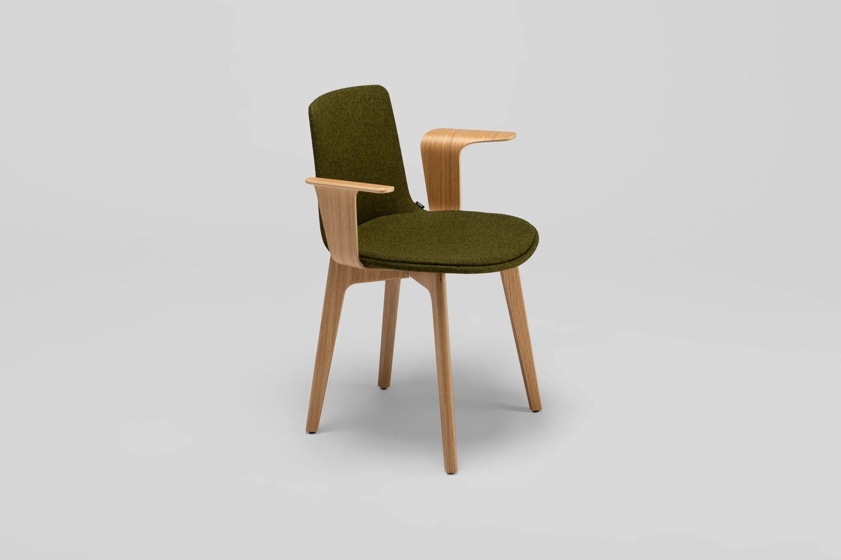 Lottus Wood armchair, with a 4-legged oak or birch wooden structure, has a broad range of finishes available: wooden shell with upholstered seat pad, polypropylene shell with or without polypropylene or upholstered seat pad, or fully upholstered one. Besides, it has two different heights of backrest, standard and High one, and oak wooden armrests.