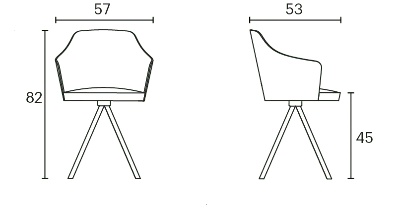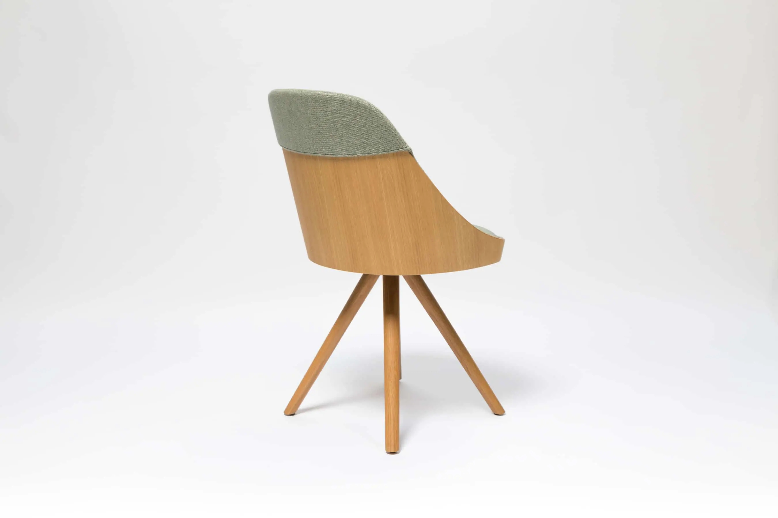 Kaiak spin wood chair, with a natural or stained oak curved shell in combination with solid wooden legs, has a broad range of upholstery options available: fully upholstered, upholstered seat, three quarters upholstered and inside upholstery. This model brings warmth and comfort for soft office or hospitality spaces.