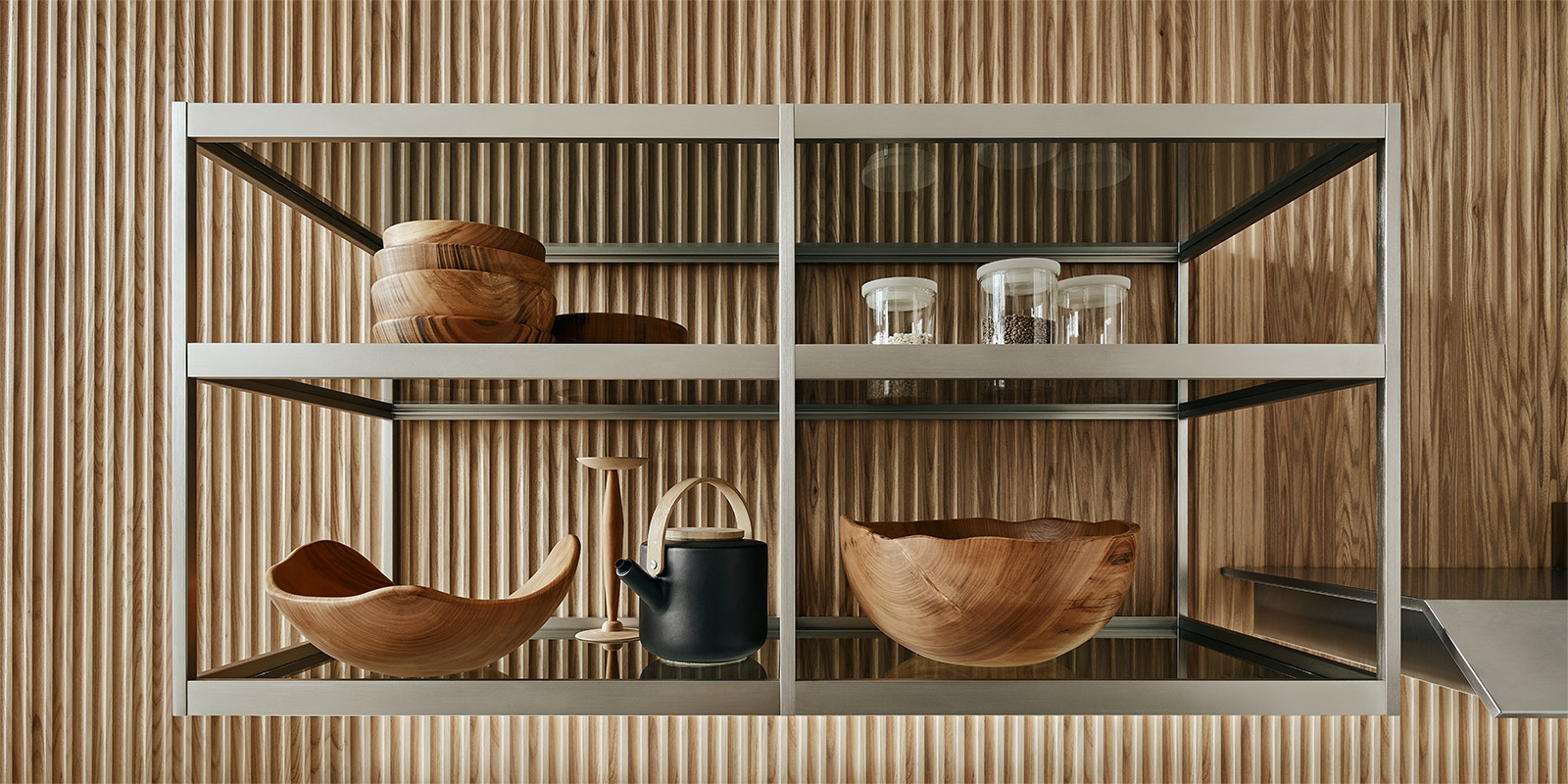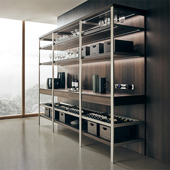 由立式鋼柱組成的模塊化開放系統(tǒng),這些鋼柱用于支撐可承載透明灰玻璃擱板的水平鋁型材。LED 照明。