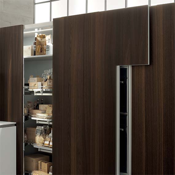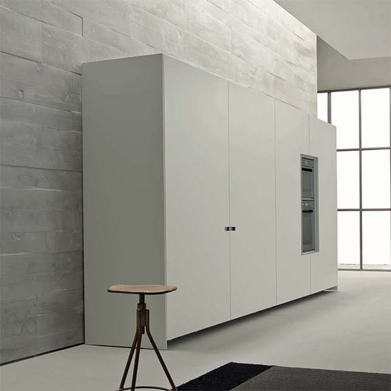 柜門采用受電弓設(shè)計(jì)的櫥柜系統(tǒng),能與廚房的模塊化方案完美融合。既可以在特定部分中放置可見的電器,也可以借助“Ernestomeda 安全烤箱關(guān)閉”選配安全系統(tǒng)隱藏電器。