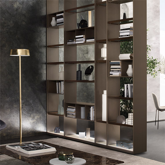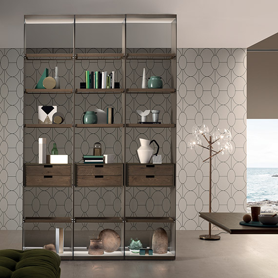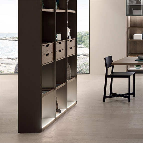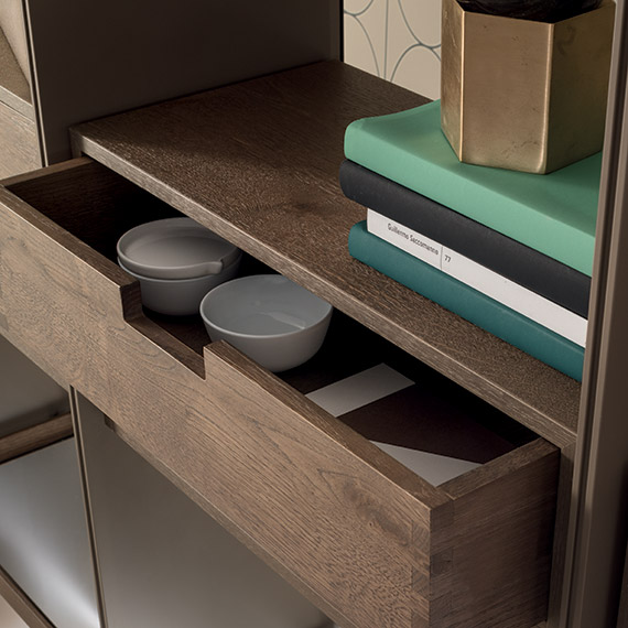Mud Flat Matt 涂漆側(cè)板。透明灰色玻璃背板。透明灰色玻璃擱板,飾有多節(jié) Terra d'Ombra 橡木鑲邊。多節(jié) Terra d'Ombra 橡木材質(zhì)的抽屜柜。特清磨砂玻璃頂板和地板,飾有多節(jié) Terra d'Ombra 橡木鑲邊。