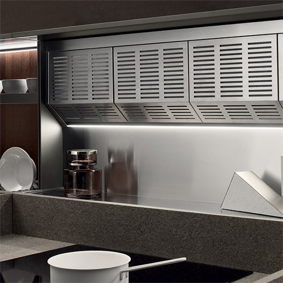 排風罩集成在嵌入式吊柜中,而且具有專用開啟系統(tǒng),可以縮小到側(cè)板厚度。