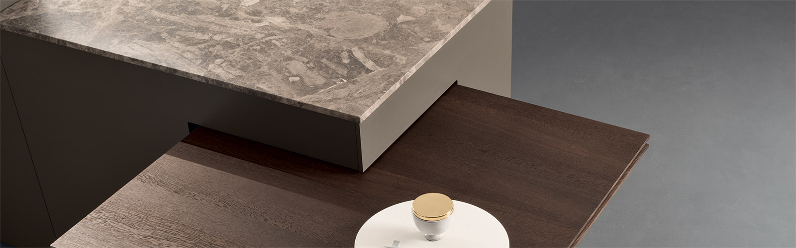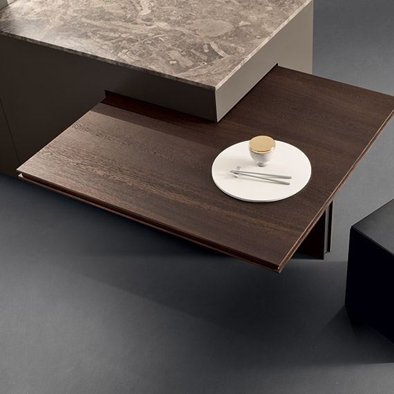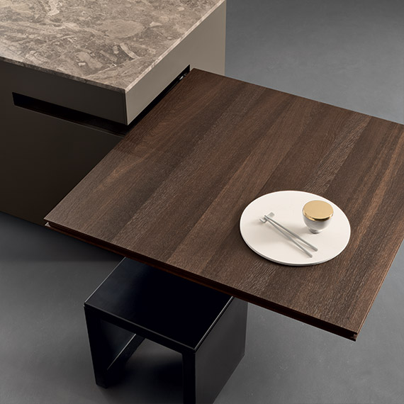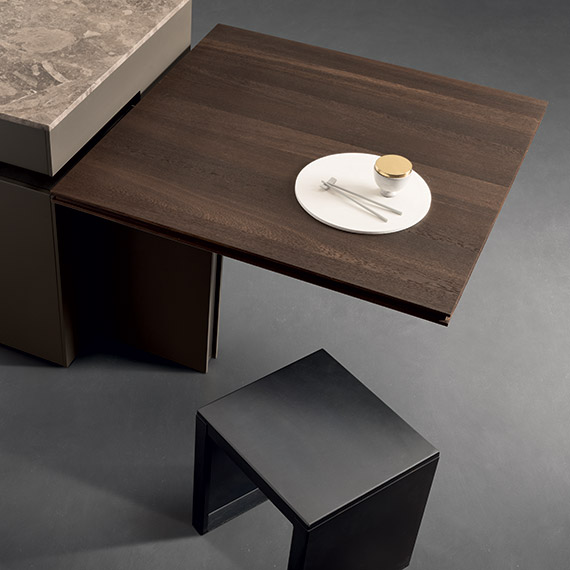 多節(jié) Terra d'Ombra 橡木材質(zhì)的旋轉(zhuǎn)桌。臺(tái)面選材為經(jīng)熱處理的橡木,框架采用 Mocha Flat Matt 噴漆處理。