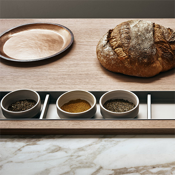 可以選擇三種 K-lab 橡木或高級(jí)木材(復(fù)古橡木和櫟木),設(shè)有可容納鋼制餐具托盤的凹槽。