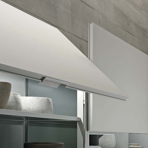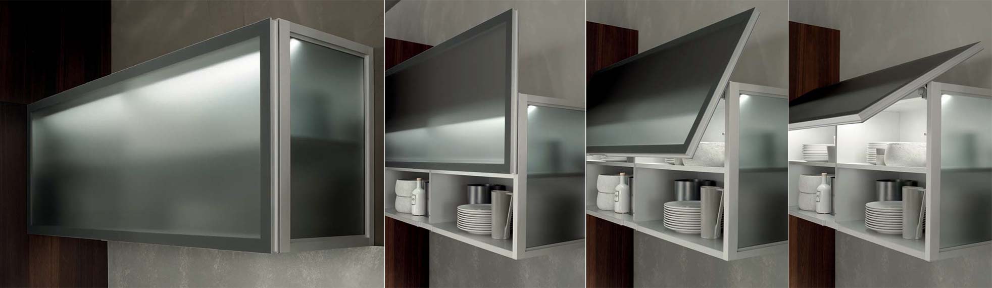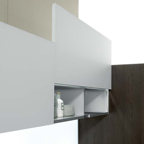 帶有獨特的開合系統(tǒng)的新型吊柜。打開時,先垂直滑動,然后旋轉,讓使用者能夠進入整個吊柜的內部。在這個位置,門處于可輕松伸手關門的高度。這一專屬系統(tǒng)的主要特點在于重量輕、可控制、使用方便。