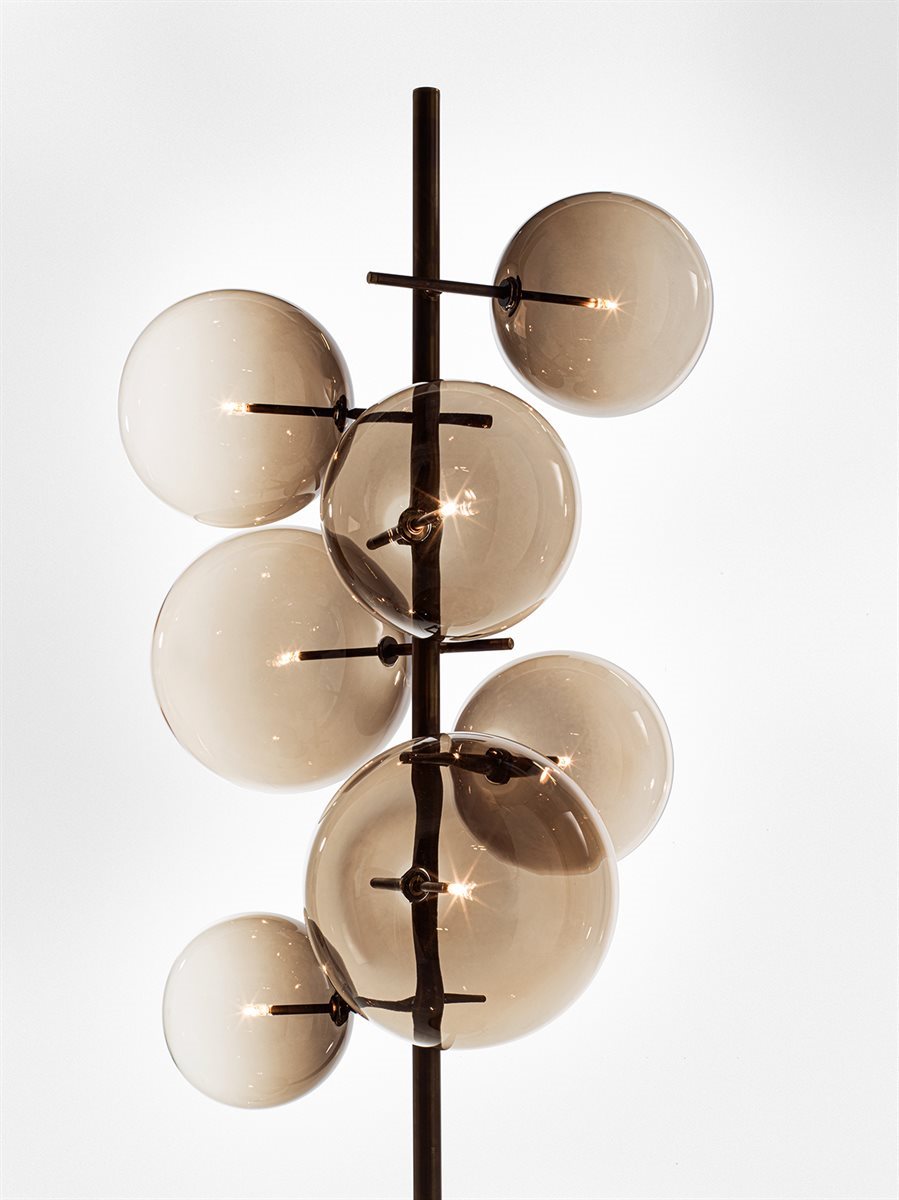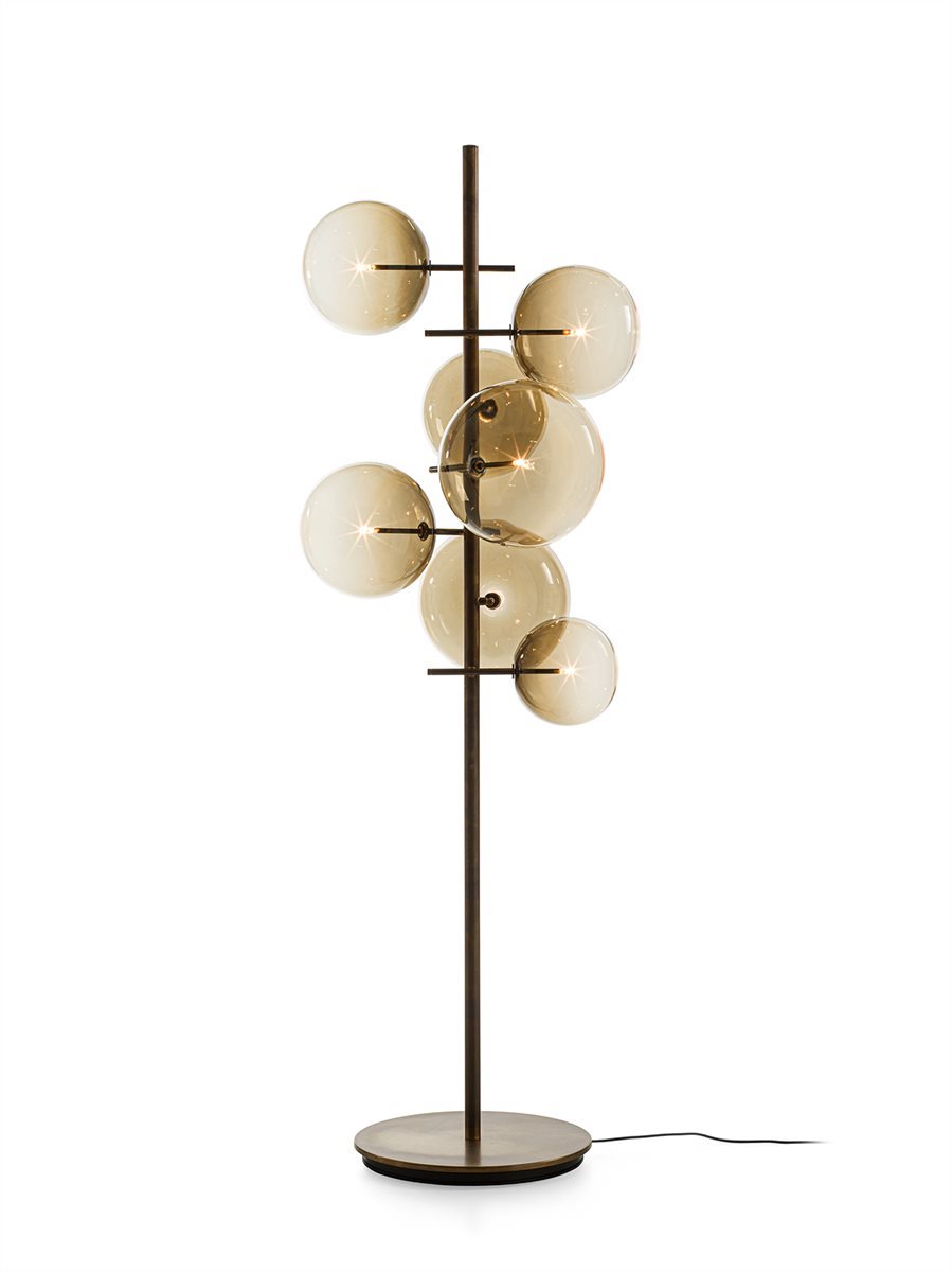 Lampada da terra a luce LED dimmerabile dotata di 7 sfere in cristallo trasparente soffiato a bocca. Disponibile anche versione con sfere colorate in cristallo soffiato a bocca nei colori “topazio”, “ambra”, “ametista” e “bronzite”. Parti metalliche in ottone brunito a mano. Dimmer presente sul cavo di alimentazione. Basamento in ottone brunito a mano e metallo laccato nero.