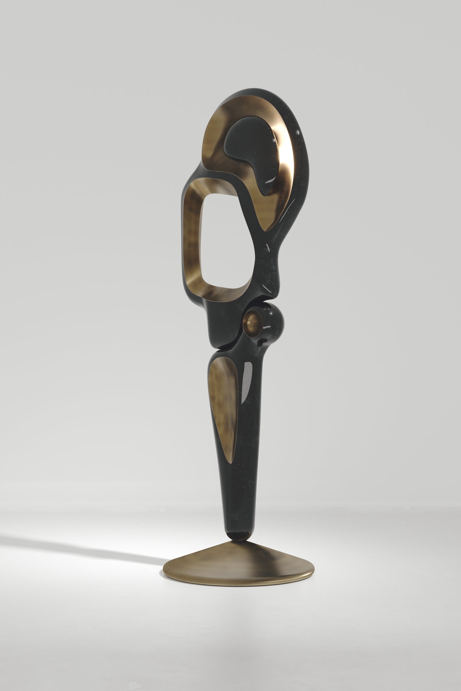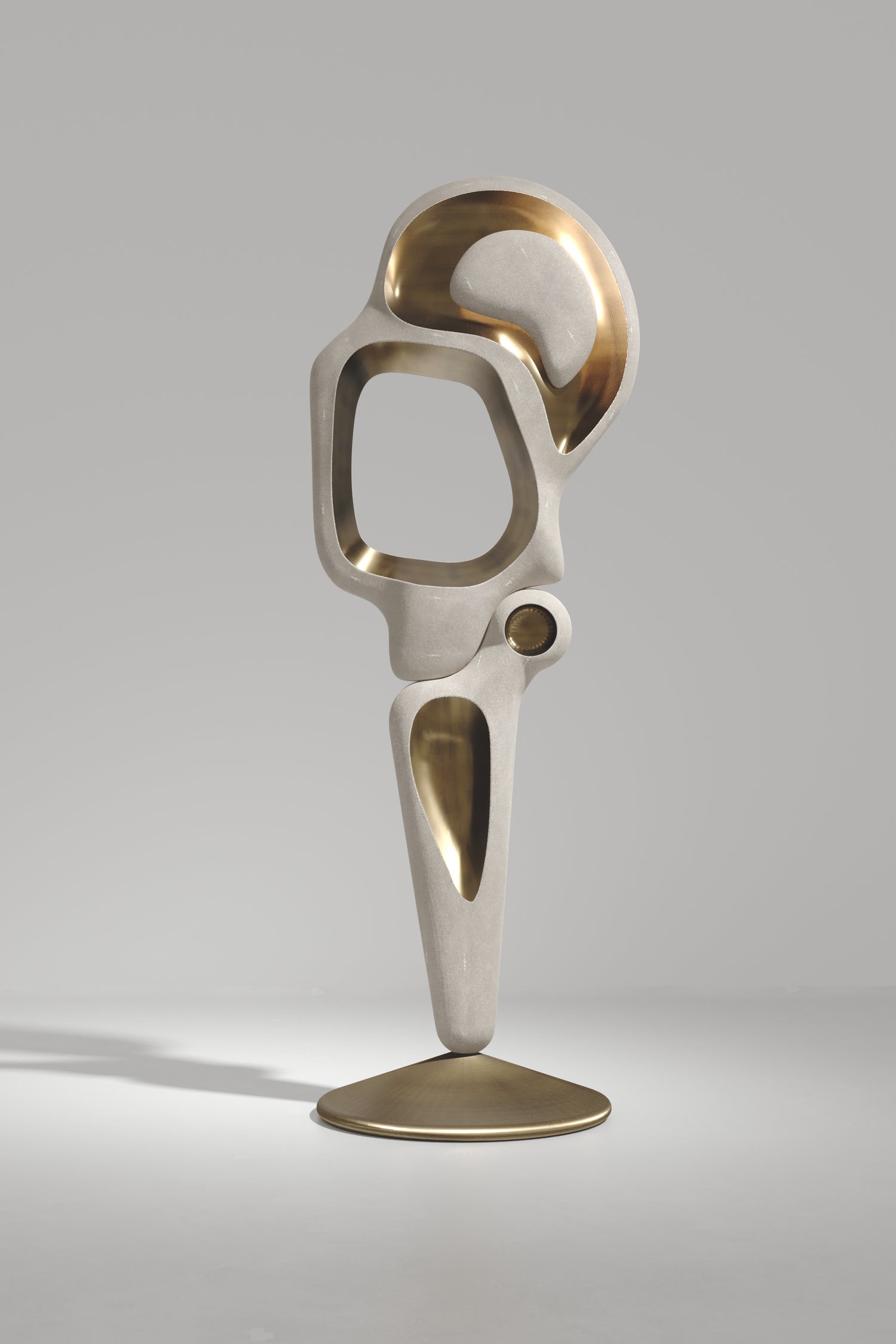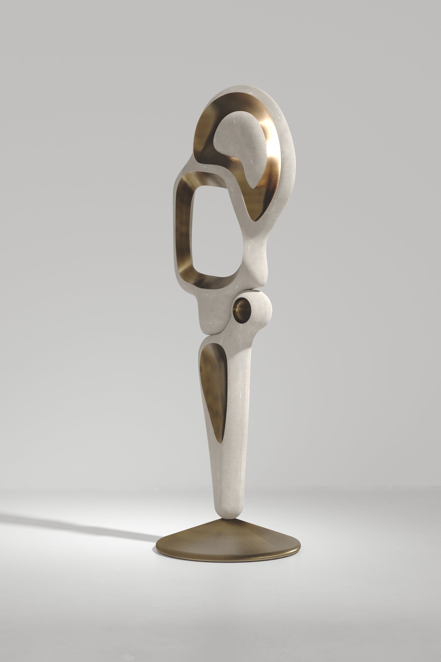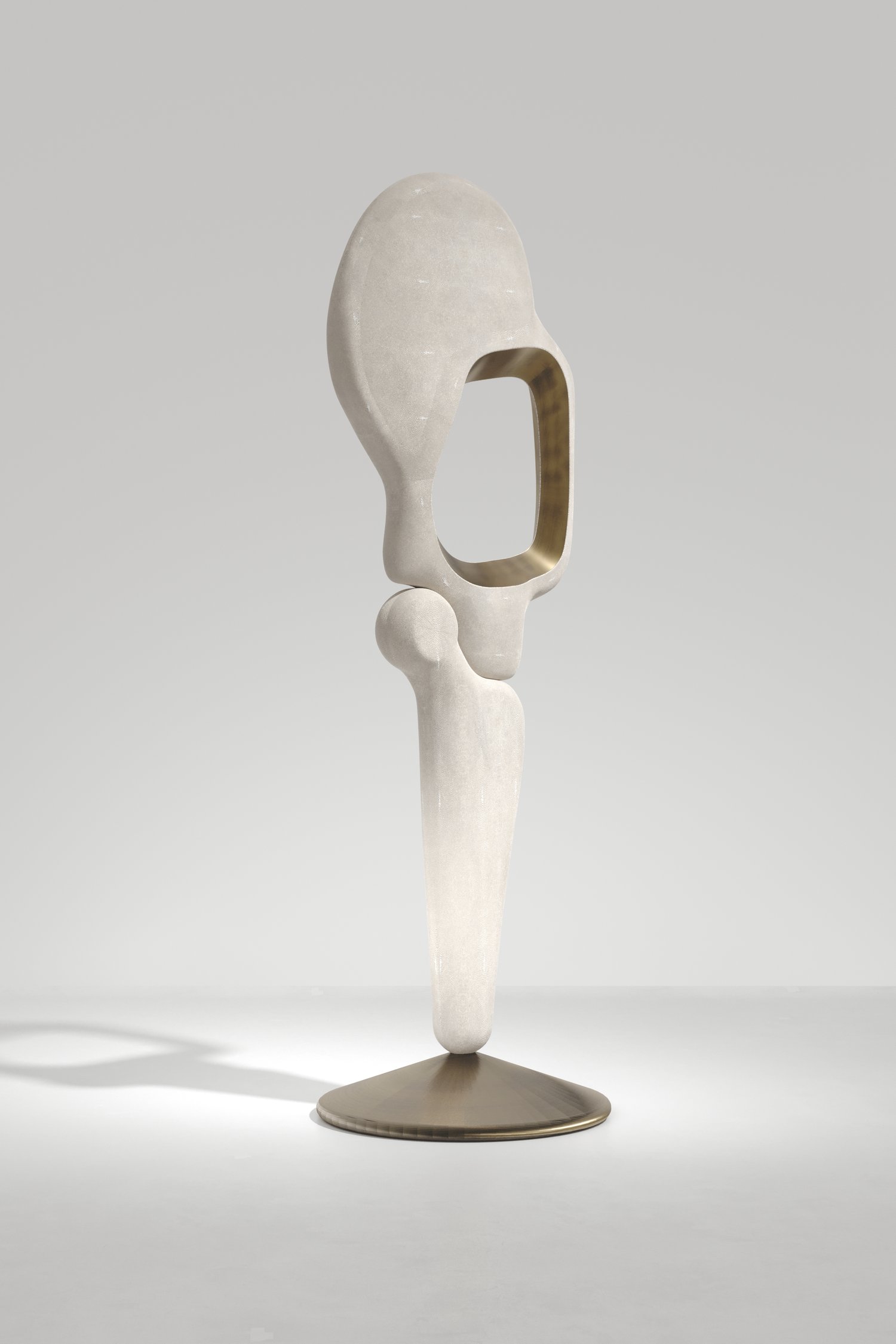 The Owl Floor lamp by R & Y Augousti is sculptural piece with a vintage-modern feel. The piece explores bulbous organic curves and cut outs with subtle detailing to create the signature Augousti aesthetic. The suspended parts covering the light source, create a beautiful illusion within the shapes of the piece. The piece is inlaid in a mixture of shell or shagreen with bronze patina brass. Part of the Owl capsule, see images at end of slide.