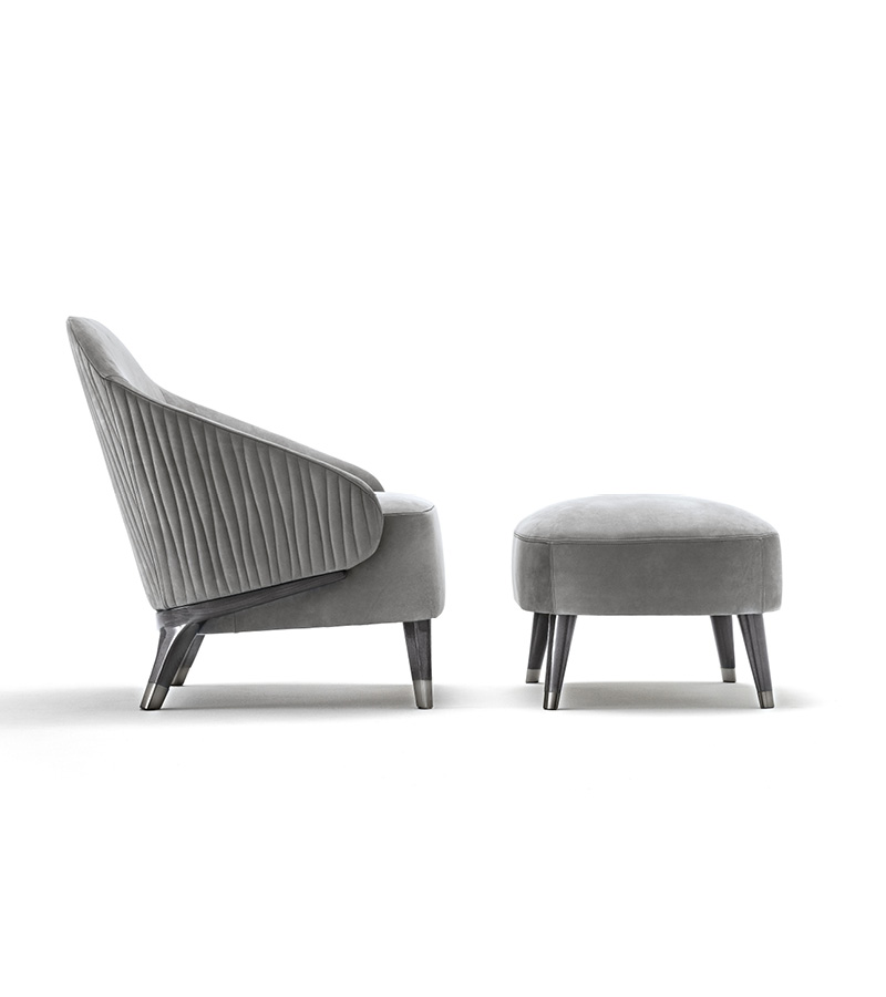 Ottoman for occasional chair available in fìrst grade leather, nubuk leather, lizard printed leather, velvet or suede fabric. Seat with double stitching in polyurethane foam wrapped in down feather. 4 legs with details in satin black nickel stainless steel.