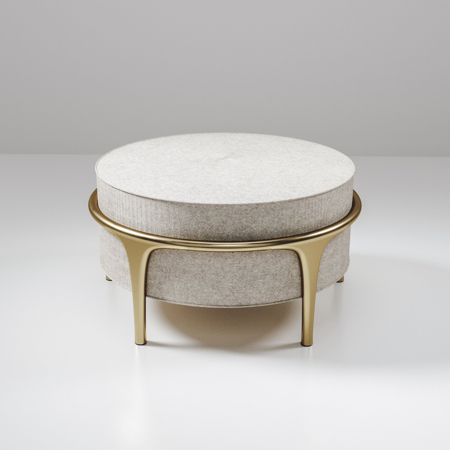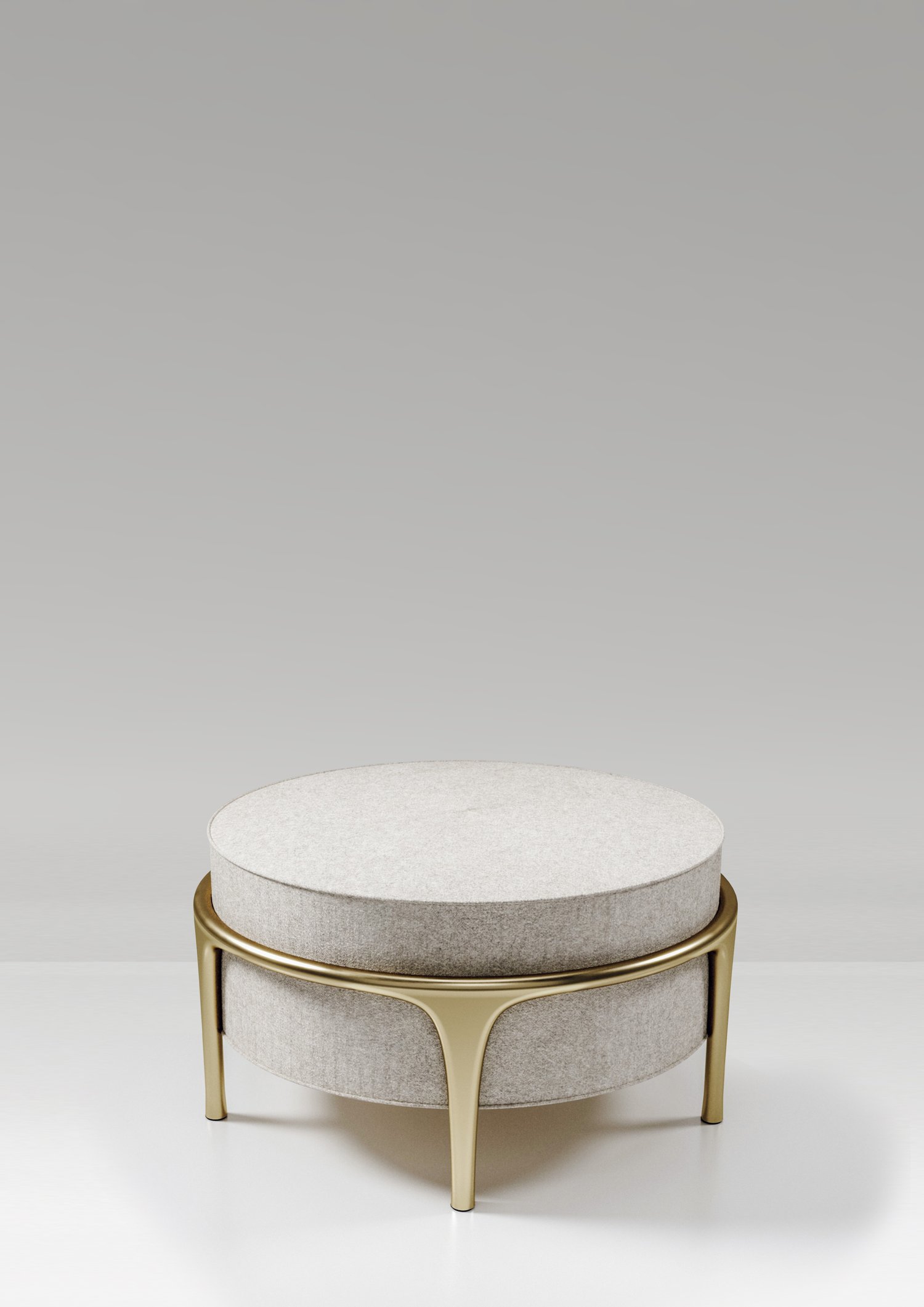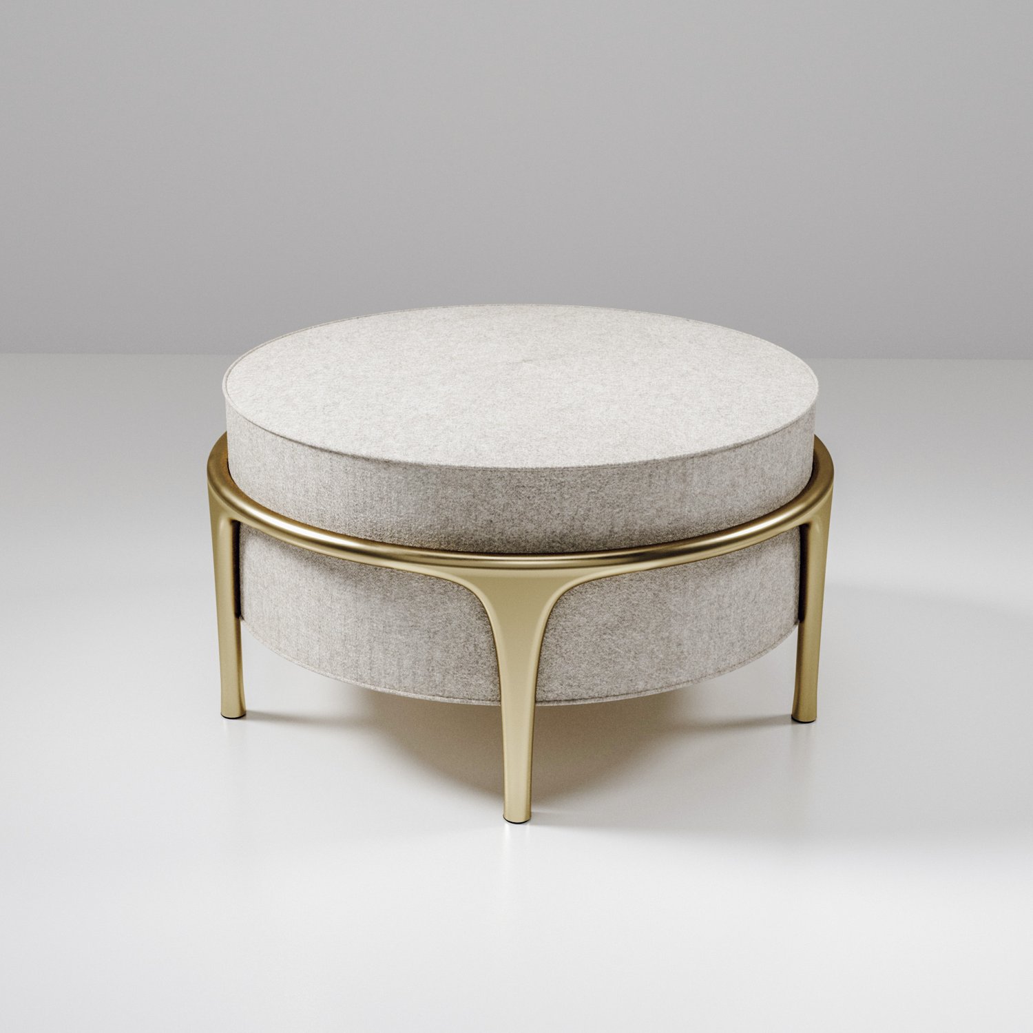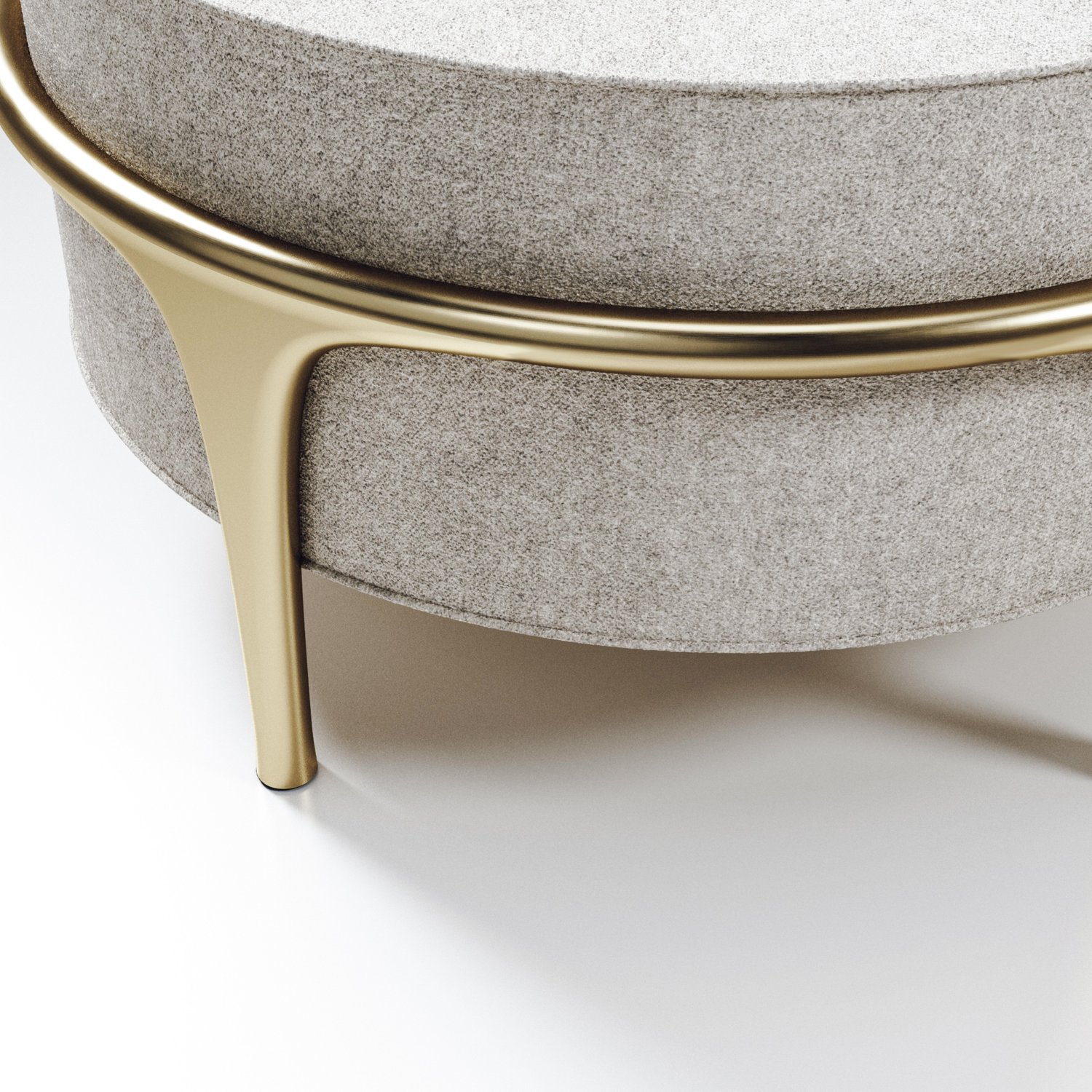 The Ramo ottoman by R & Y Augousti is an elegant and versatile piece. The upholstered piece in cream Pierre Frey fabric provides comfort while retaining a unique aesthetic with the bronze-patina brass frame and details. Part of the Ramo Seating Series.